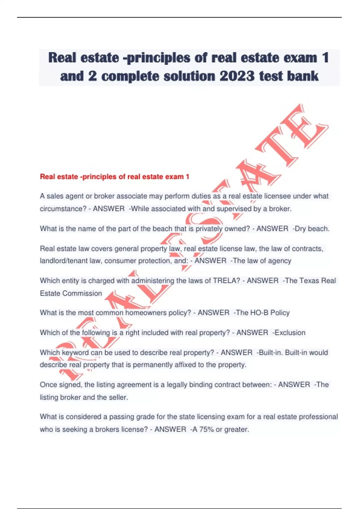 Real estate -principles of real estate exam 1 and 2 complete solution 2023 test bank