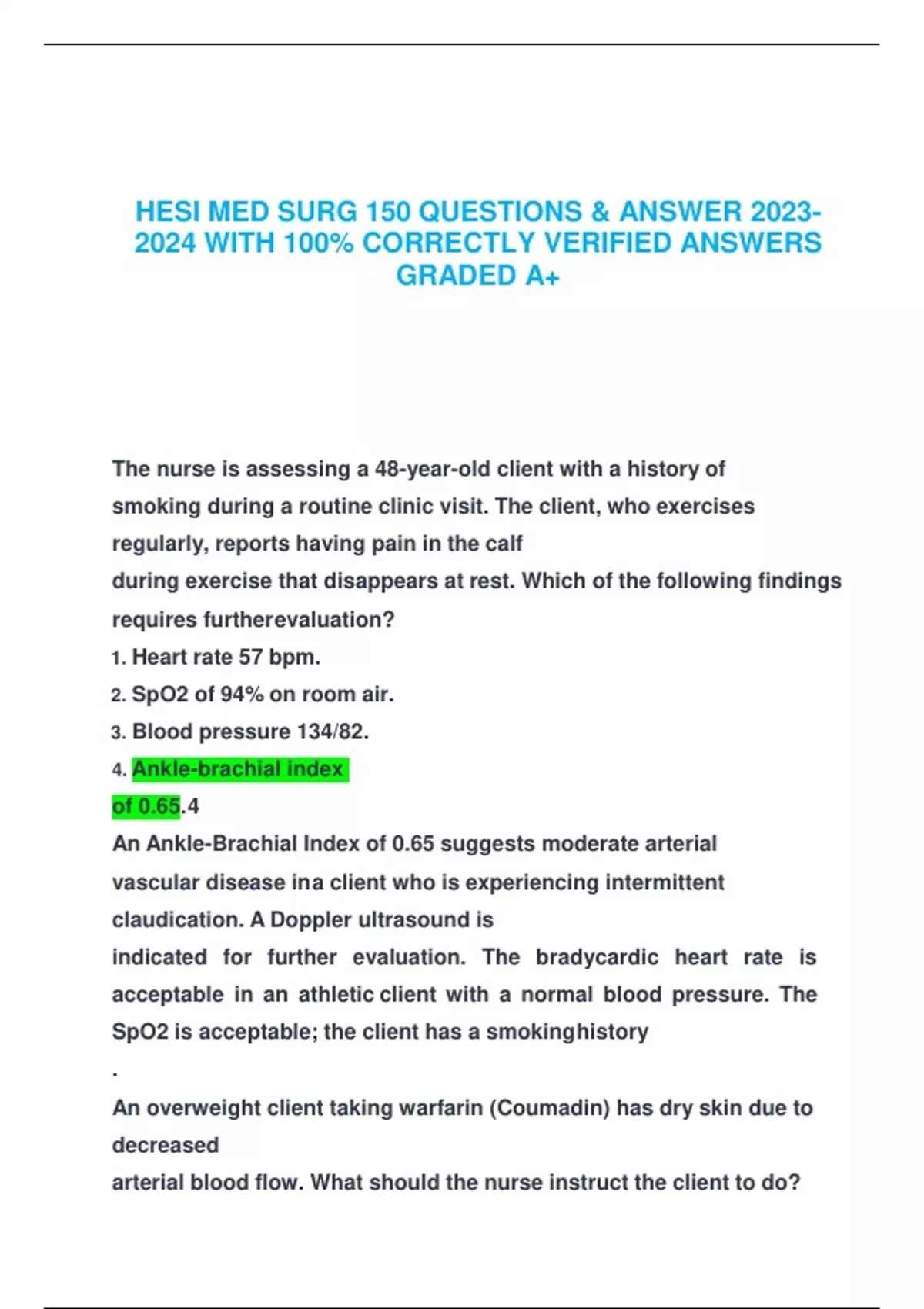HESI MED SURG 150 QUESTIONS & ANSWER WITH 100% CORRECTLY VERIFIED ANSWERS
