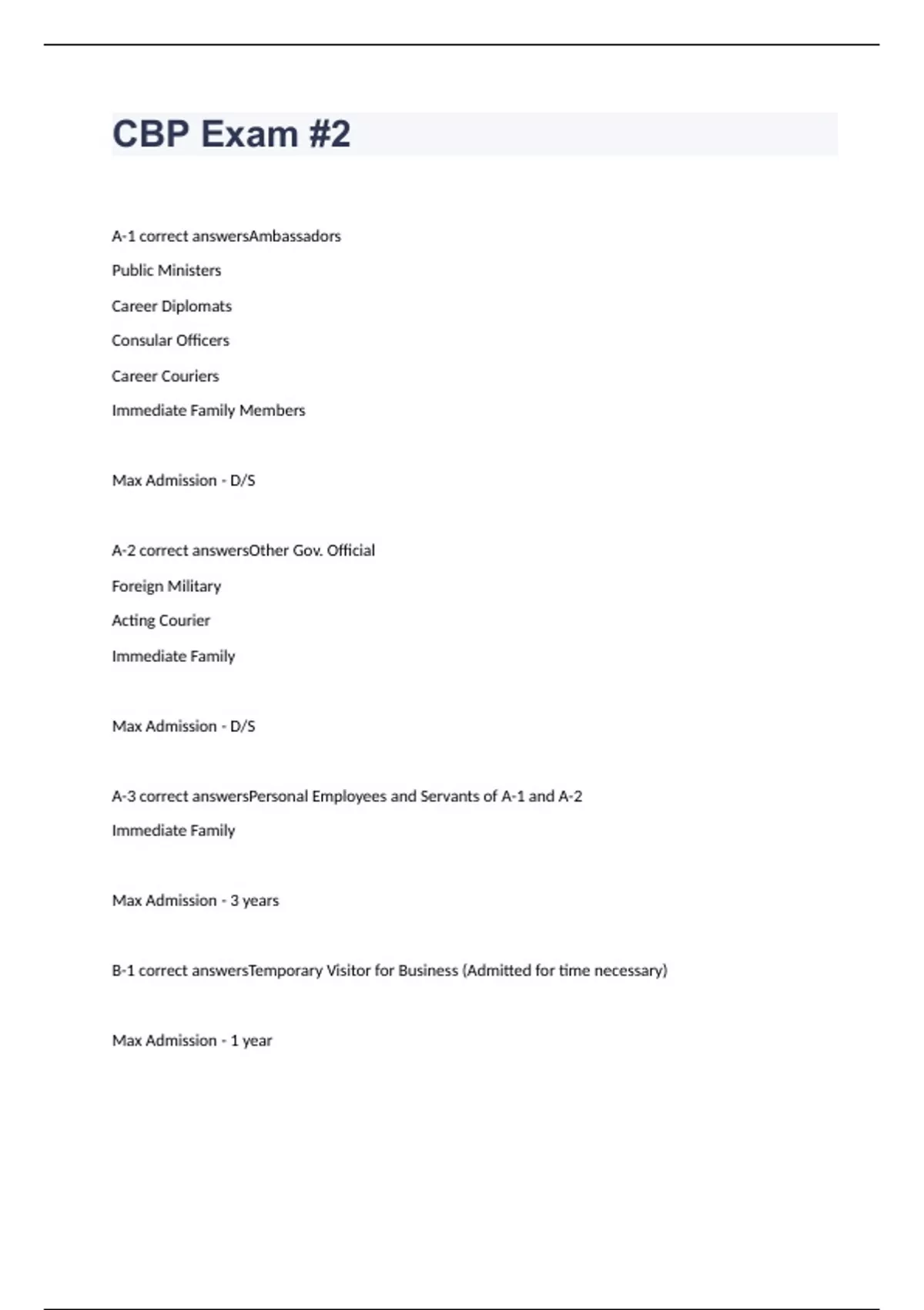 A-1 correct answersAmbassadors Public Ministers Career Diplomats Consular Officers Career Couriers Immediate Family Members Max Admission - D/S A-2 correct answersOther Gov. Official Foreign Military Acting Courier Immediate Family Max Admission - D/S A-3 correct answersPersonal Employees and Servants of A-1 and A-2 Immediate Family Max Admission - 3 years B-1 correct answersTemporary Visitor for Business (Admitted for time necessary) Max Admission - 1 year
