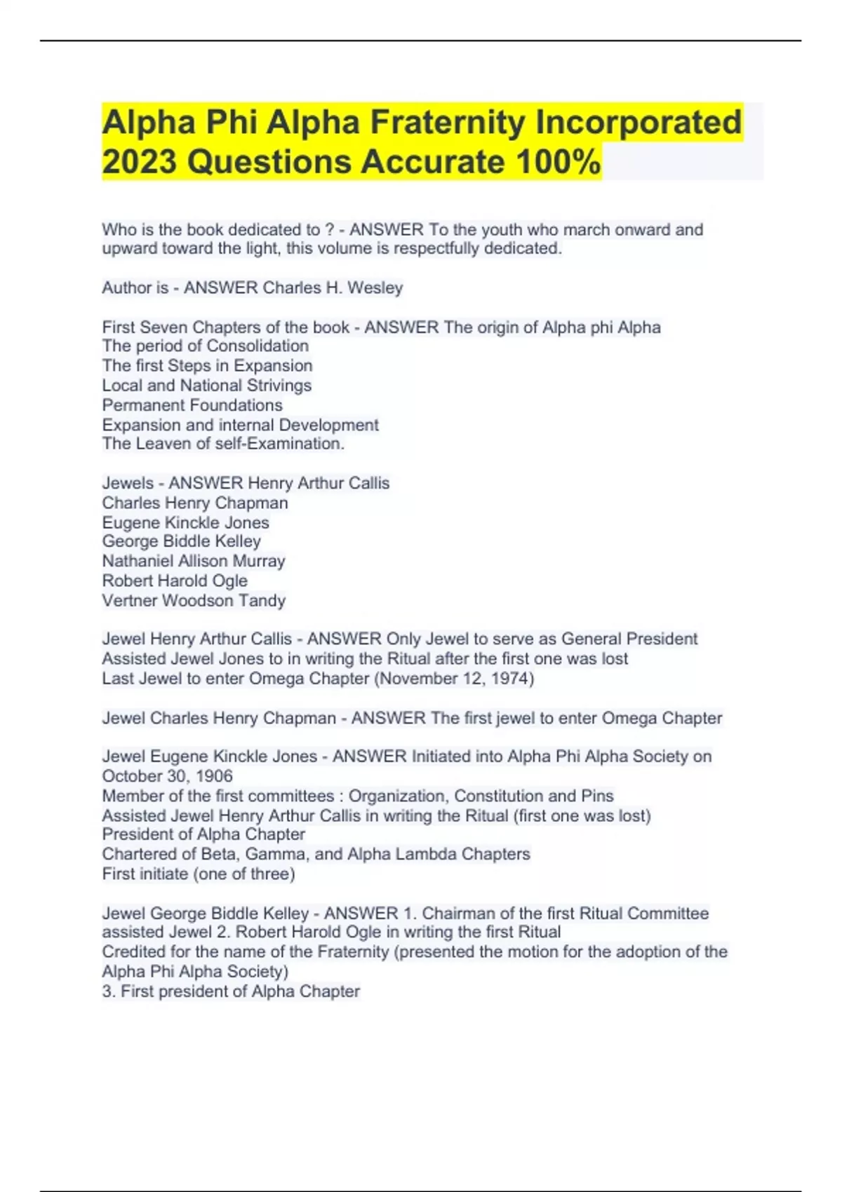 Who is the book dedicated to ? - ANSWER To the youth who march onward and upward toward the light, this volume is respectfully dedicated. Author is - ANSWER Charles H. Wesley First Seven Chapters of the book - ANSWER The origin of Alpha phi Alpha The period of Consolidation The first Steps in Expansion Local and National Strivings Permanent Foundations Expansion and internal Development The Leaven of self-Examination. Jewels - ANSWER Henry Arthur Callis Charles Henry Chapman Eugene Kinckle Jones George Biddle Kelley Nathaniel Allison Murray Robert Harold Ogle Vertner Woodson Tandy Jewel Henry Arthur Callis - ANSWER Only Jewel to serve as General President Assisted Jewel Jones to in writing the Ritual after the first one was lost Last Jewel to enter Omega Chapter (November 12, 1974) Jewel Charles Henry Chapman - ANSWER The first jewel to enter Omega Chapter Jewel Eugene Kinckle Jones - ANSWER Initiated into Alpha Phi Alpha Society on October 30, 1906 Member of the first committees : Organization, Constitution and Pins Assisted Jewel Henry Arthur Callis in writing the Ritual (first one was lost) President of Alpha Chapter Chartered of Beta, Gamma, and Alpha Lambda Chapters First initiate (one of three) Jewel George Biddle Kelley - ANSWER 1. Chairman of the first Ritual Committee assisted Jewel 2. Robert Harold Ogle in writing the first Ritual Credited for the name of the Fraternity (presented the motion for the adoption of the Alpha Phi Alpha Society) 3. First president of Alpha Chapter The Aims - ANSWER The aims of AlpAlpha Phi Alpha Fraternity Incorporated 2023 Questions Accurate 100%