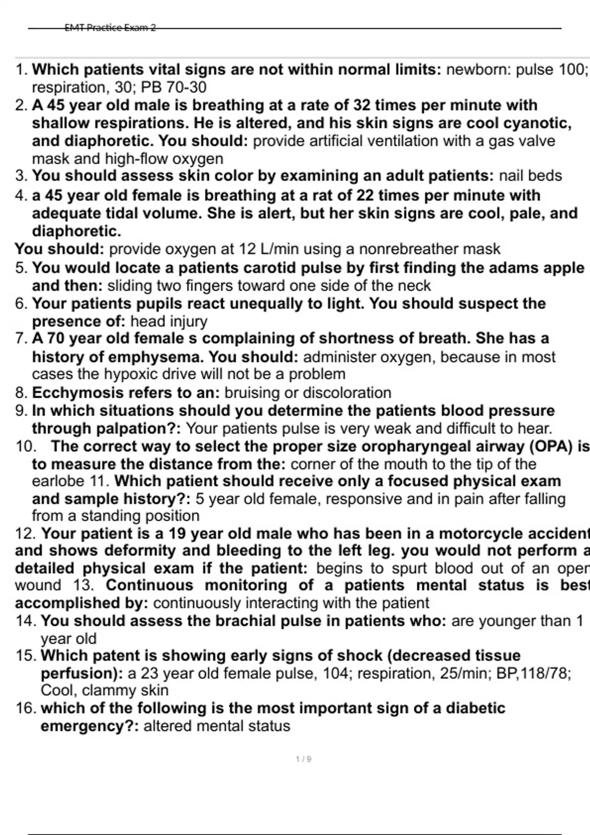 EMT PRACTICE EXAM 2 QUESTIONS WITH CORRECT ANSWER GRADED TO PASS