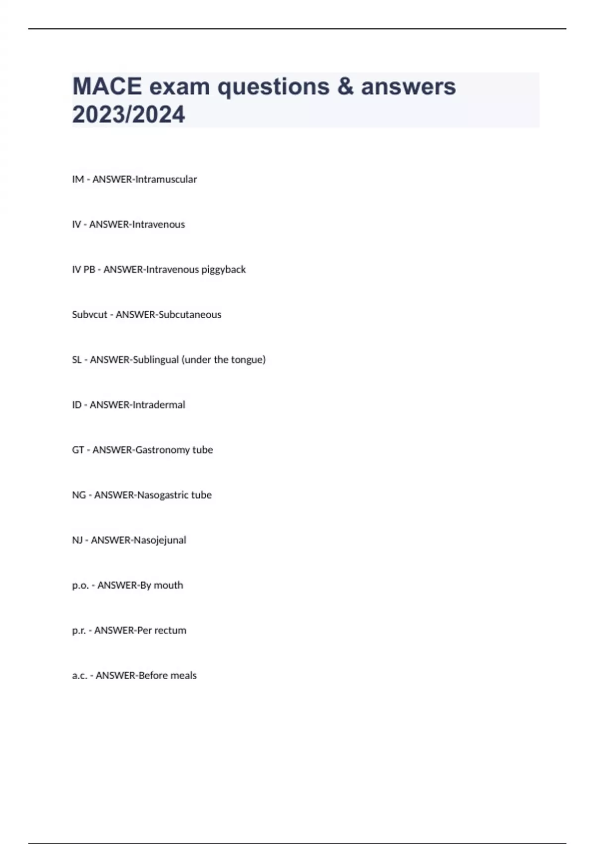 MACE exam questions & answers 2023/2024 IM - ANSWER-Intramuscular IV - ANSWER-Intravenous IV PB - ANSWER-Intravenous piggyback Subvcut - ANSWER-Subcutaneous SL - ANSWER-Sublingual (under the tongue) ID - ANSWER-Intradermal GT - ANSWER-Gastronomy tube NG - ANSWER-Nasogastric tube NJ - ANSWER-Nasojejunal p.o. - ANSWER-By mouth p.r. - ANSWER-Per rectum a.c. - ANSWER-Before meals