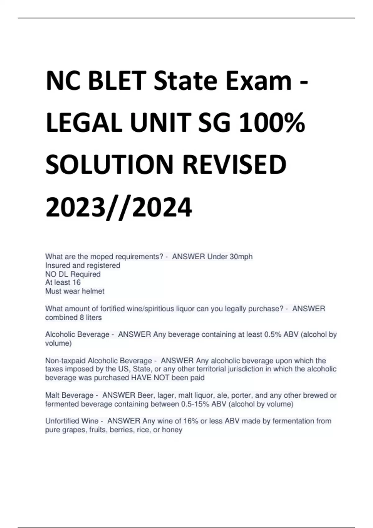NC BLET State Exam - LEGAL UNIT SG 100% SOLUTION REVISED 2023//2024 What are the moped requirements? - ANSWER Under 30mph Insured and registered NO DL Required At least 16 Must wear helmet What amount of fortified wine/spiritious liquor can you legally purchase? - ANSWER combined 8 liters Alcoholic Beverage - ANSWER Any beverage containing at least 0.5% ABV (alcohol by volume) Non-taxpaid Alcoholic Beverage - ANSWER Any alcoholic beverage upon which the taxes imposed by the US, State, or any other territorial jurisdiction in which the alcoholic beverage was purchased HAVE NOT been paid Malt Beverage - ANSWER Beer, lager, malt liquor, ale, porter, and any other brewed or fermented beverage containing between 0.5-15% ABV (alcohol by volume) Unfortified Wine - ANSWER Any wine of 16% or less ABV made by fermentation from pure grapes, fruits, berries, rice, or honey Fortified Wine - ANSWER Any wine of more than 16% and no more than 24% ABV made by fermentation from pure grapes, fruits, berries, rice, or honey Spiritious Liquor - ANSWER Distilled spirits or ethyl alcohol including spirits of wine, whiskey, rum, brandy, gin, and all other distilled spirits and mixtures of cordials liquor and premixed cocktails, in closed containers for beverage use regardless of their dilution Mixed Beverage - ANSWER A drink composed in whole or in part of spiritious liquor and served in a quantity less than a quantity in a closed package, or a premised cocktail served from a closed package containing only one serving Sale - ANSWER Any transfer, trade, exchange, or barter in any manner or by any means for consideration (something of value received by person who sells) What amount of malt beverages can you legally purchase? - ANSWER Any amount in kegs, and 80 liters in cans and bottles (80 liters = 9 cases and 9 (12 oz.) cans) What amount of unfortified wine can you legally purchase? - ANSWER 50 liters With a Purchase Transportation Permit, what amounts can you legally transport? - ANSWER Malt Beverages: Amount you can purchase Unfortified Wine: 100 liters Fortified Wine/Spiritious Liquor: 40 liters combined In a Taxi - ANSWER 1. Unlawful to transport fortified wine or spirituous liquor in other than the original closed container (seal cannot be broken) 2. Not more than 8 liters of fortified wine and spirituous liquor by each passenger Gambling - ANSWER 1. Game of chance - determined entirely or in part by lot or mere luck, and in which judgment, practice, skill or adroitness have honestly no office at all, or are thwarted by chance. 2. Side betting (betting on another person's skills) is considered gambling. Unlike narcotic drugs, these drugs create a feeling of excitement, greater energy, and alertness. (most common is cocaine) - ANSWER Stimulant On premises consumption - ANSWER Consumption must be done before 7:00 am or 2:30 am. Cannot consume on licensed premises before noon on Sunday. Sales on Monday - Saturday, then on Sunday - ANSWER After 7:00 and before 2:00 am and noon and before 2:00 am 15A-401 - When can you make a warrant-less arrest that occurred OUTSIDE of the officers presence? - ANSWER *Has committed the misdemeanor offense of concealment of merchandise, domestic criminal trespass, impaired driving, or impaired driving in commercial vehicle, or * Has committed the misdemeanor offense of simple assault, simple assault and battery, simple affray, assault inflicting serious injury or using a deadly weapon, assault on a female, or assault by pointing a gun when the offense was committed by a person with whom the alleged victim has a personal relationship as defined in the domestic violence statute, or Has committed the misdemeanor offense of violation of a valid domestic violence protective order, or Has violated a pretrial release order When a private person assists a law enforcement officer (G.S. 15A-405) they are or are not liable? - ANSWER The citizen is not subject to criminal or civil liability when providing this assistance and is entitled to worker's compensation if injured. When it comes to searching a car without a warrant and consent, what can an officer