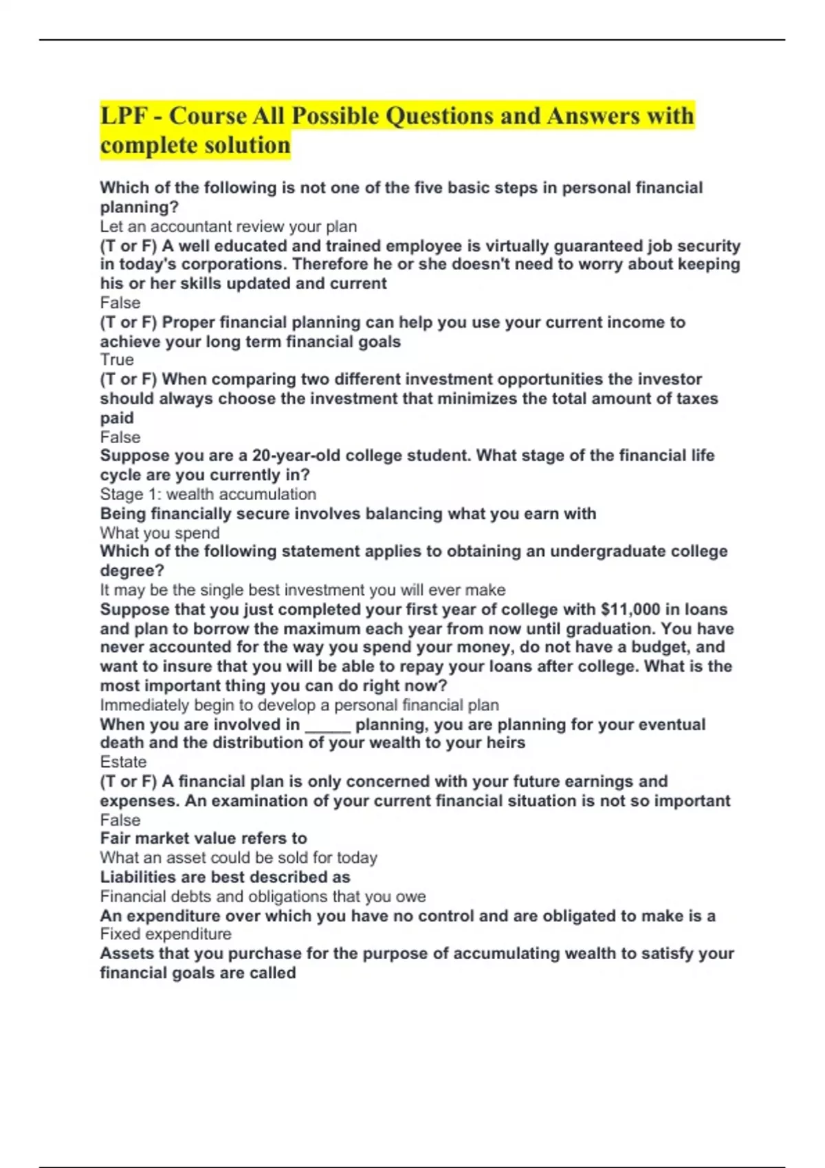 (T or F) A financial plan is only concerned with your future earnings and