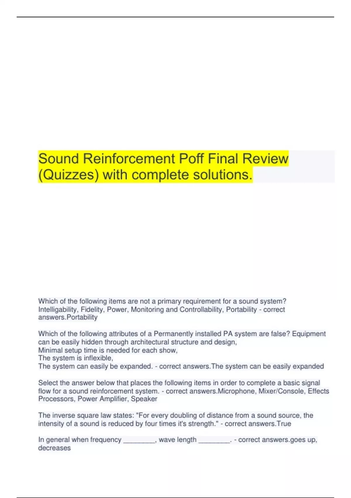 Sound Reinforcement Poff Final Review (Quizzes) with complete solutions.