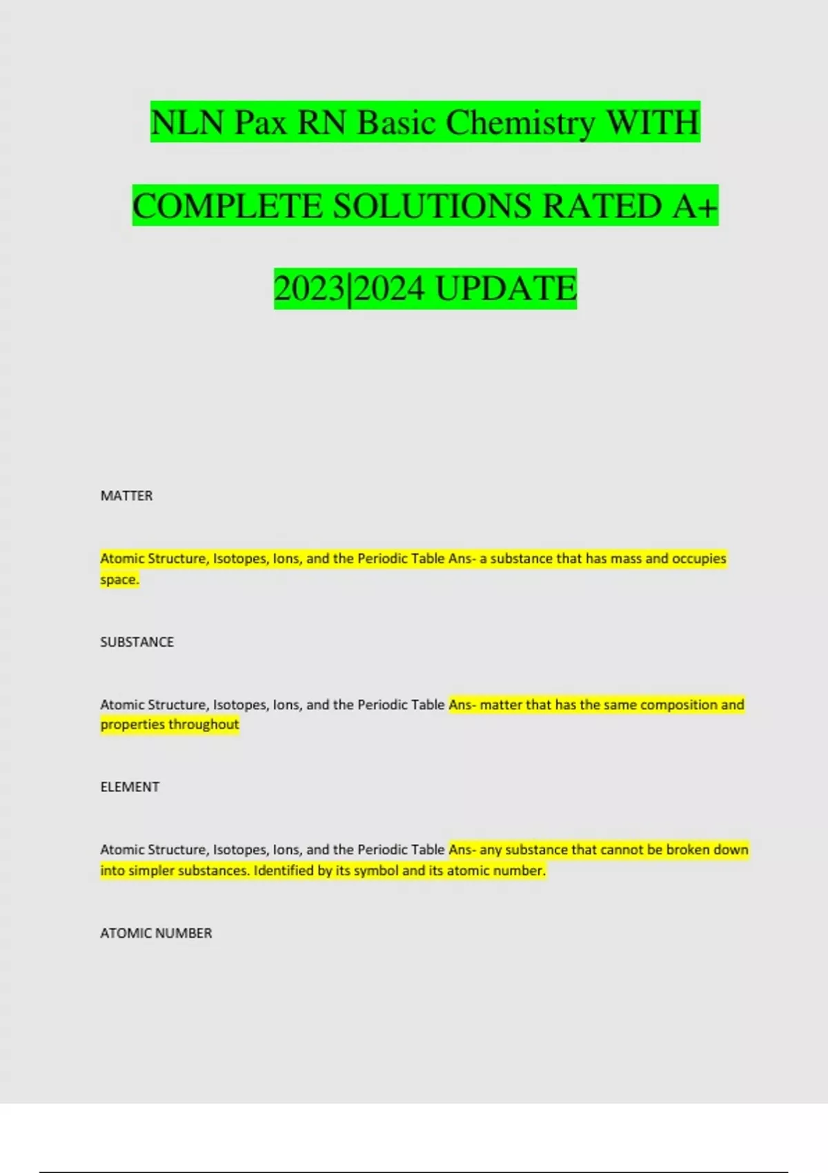 NLN Pax RN Basic Chemistry WITH COMPLETE SOLUTIONS RATED A+ 2023|2024 UPDATE