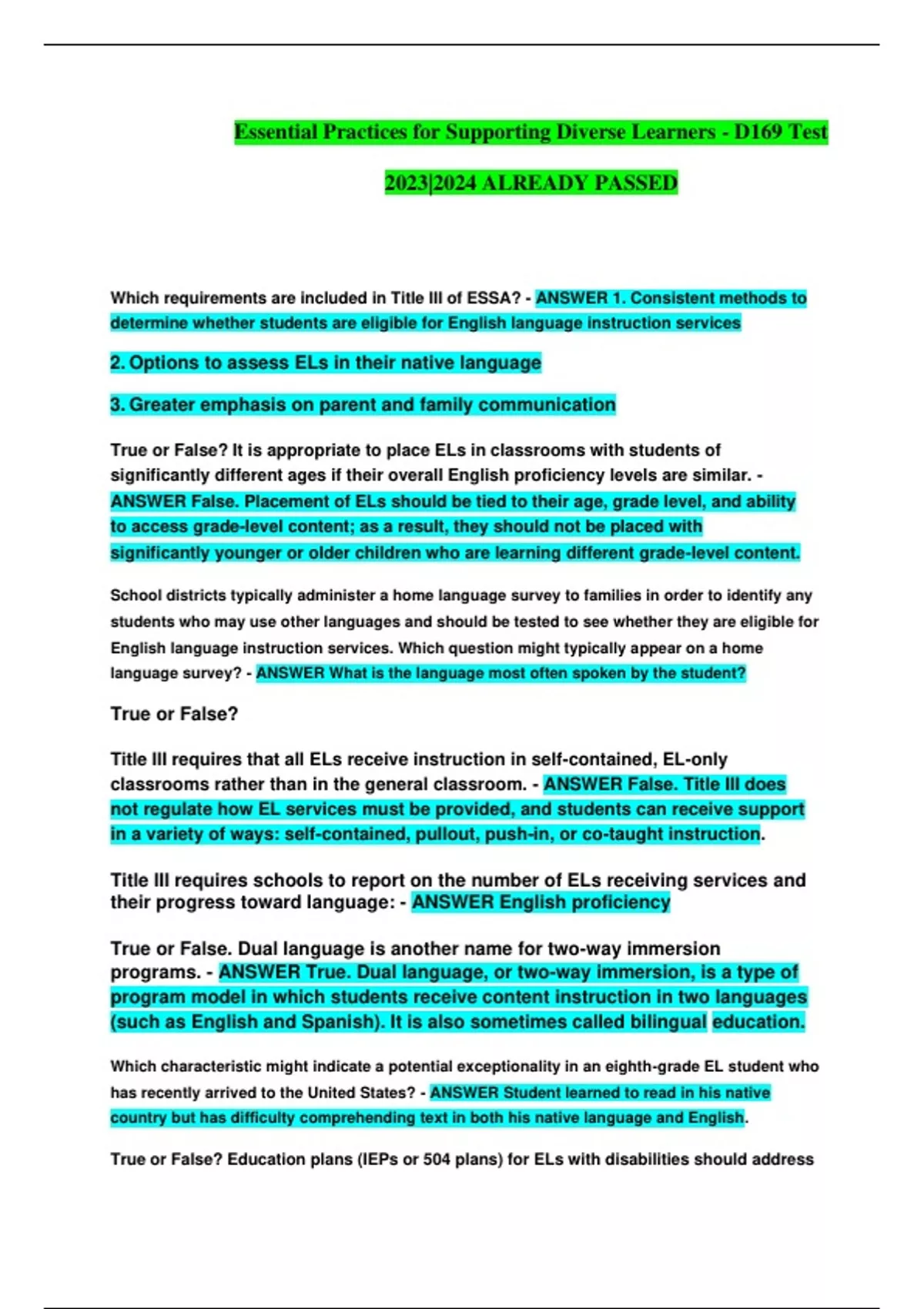 Essential Practices for Supporting Diverse Learners - D169 Test 2023|2024 ALREADY PASSED Which requirements are included in Title III of ESSA? - ANSWER 1. Consistent methods to determine whether students are eligible for English language instruction services 2. Options to assess ELs in their native language 3. Greater emphasis on parent and family communication True or False? It is appropriate to place ELs in classrooms with students of significantly different ages if their overall English proficiency levels are similar. - ANSWER False. Placement of ELs should be tied to their age, grade level, and ability to access grade-level content; as a result, they should not be placed with significantly younger or older children who are learning different grade-level content. School districts typically administer a home language survey to families in order to identify any students who may use other languages and should be tested to see whether they are eligible for English language instruction services. Which question might typically appear on a home language survey? - ANSWER What is the language most often spoken by the student? True or False? Title III requires that all ELs receive instruction in self-contained, EL-only classrooms rather than in the general classroom. - ANSWER False. Title III does not regulate how EL services must be provided, and students can receive support in a variety of ways: self-contained, pullout, push-in, or co-taught instruction. Title III requires schools to report on the number of ELs receiving services and their progress toward language: - ANSWER English proficiency True or False. Dual language is another name for two-way immersion programs. - ANSWER True. Dual language, or two-way immersion, is a type of program model in which students receive content instruction in two languages (such as English and Spanish). It is also sometimes called bilingual education. Which characteristic might indicate a potential exceptionality in an eighth-grade EL student who has recently arrived to the United States? - ANSWER Student learned to read in his native country but has difficulty comprehending text in both his native language and English. True or False? Education plans (IEPs or 504 plans) for ELs with disabilities should address students' native language proficiency as well as their English proficiency and academic skills. - ANSWER True. IEPs and 504 plans should be formulated based on students' native language skills as well as their English skills and should include goals and supports in both languages as appropriate