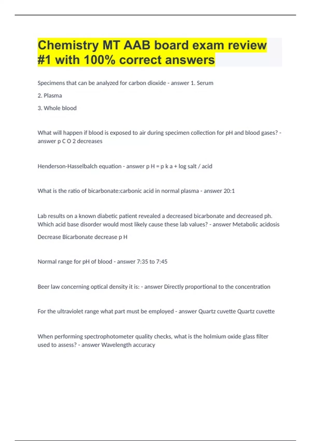 Specimens that can be analyzed for carbon dioxide 1. Serum 2. Plasma 3. Whole blood What will happen if blood is exposed to air during specimen collection for pH and blood gases? p C O 2 decreases Henderson-Hasselbalch equation p H = p k a + log salt / acid What is the ratio of bicarbonate:carbonic acid in normal plasma 20:1 Lab results on a known diabetic patient revealed a decreased bicarbonate and decreased ph. Which acid base disorder would most likely cause these lab values? Metabolic acidosis Decrease Bicarbonate decrease p H Normal range for pH of blood 7:35 to 7:45 Beer law concerning optical density it is: Directly proportional to the concentration For the ultraviolet range what part must be employed Quartz cuvette Quartz cuvette When performing spectrophotometer quality checks, what is the holmium oxide glass filter used to assess? Wavelength accuracy What is the principle of flame photometry? Emission of a color when an element is burned What is the principle of atomic absorption spectrophotometry? It measures light absorption of electromagnetic radiation What is the light source in atomic absorption instrumentation Cathode lamp Quenching is a disadvantage in which type of instrumentation Fluorometry Which analytical method measures the amount of light scattered by the particles in solution Nephelometry p c o 2 electrode The actual pH of the sample has no effect The protein at its isoelectric point Net zero charge In immunoelectrophoresis There must be excess antibody present and constant trough distance between antibody and antigen To achieve the best levels of sensitivity and specificity, a gas chromatograph may be coupled with a Mass spectrophotometer Which colligative property is most commonly used in osmometry Freezing point Zimmerman reaction is used to detect 17-ketosteroids Hormone appears to function solely in the initiation and maintenance of lactation? Prolactin Hormone acts on the renal tubules to increase water reabsorption Anti diuretic hormone What is the major binding protein for thyroxine Thyroid binding globulin What is T3 uptake measuring Thyroid binding globulin Which hormone is important in bone and calcium metabolism Calci tonin Which hormone stimulates the renal production of vitamin D PTH Cathecholamines are secreted by Adrenal medulla The metabolite of epinephrine Vanillymandelic acid HCG is secreted by The uterus When does the highest level of HCG occur First trimester Hormone synthesized from cholesterol Testosterone What is the urinary metabolite so serotonin 5-hydroxyindoleacetic acid Migration sequence from the origin, of lipoprotein during electrophoresis Chylomicrons / beta/ pre-beta alpha Reagents used for color development in the Liebermann-Burchard reaction for cholesterol Acetic anhydride/sulfuric acid The purpose of the saponification step in cholesterol methods Convert cholesterol esters to free cholesterol Most triglycerides procedures involve the measurement of which end product Glycerol Friedwald formula by which LDL cholesterol can be calculated LDL cholesterol = cholesterol - (triglycerides / 5 + HDL cholesterol) When calculating a coronary risk index for a patient, one must know the total cholesterol and which other parameter? HDL cholesterol What is the method of choice for confirming drugs detected by screening methods? Gas chromatography-mass spectrophotometry which condition is associated with a decreased CSF glucose level? Bacterial meningitis Oligoclonal banding during CSF electrophoresis is characteristically seen in which condition Multiple Sclerosis which plasma substances is Not normally filtered through the glomerulus in significant amounts Protein Systems may be used to determine the specific gravity of urine Refractometer / harmonic oscillation / reagent test strip What is the best single indicator of renal disease Proteinuria A glitter cell is a term used to describe Leukocyte The matrix of urinary casts has been identified as which protein Tamm Horsfall mucoprotein Which one of the following casts is seen in acute glomerulonephritis Red blood cells