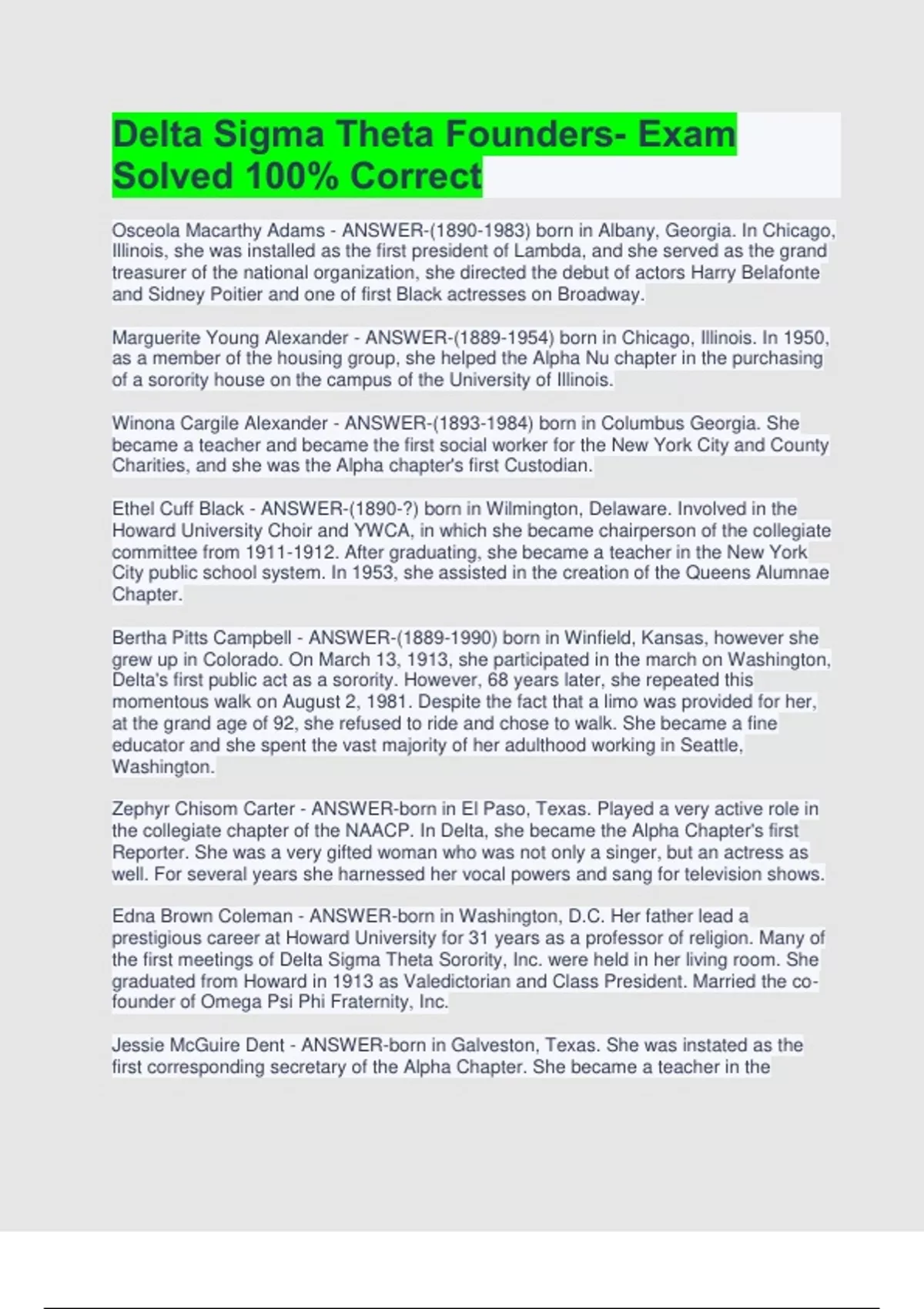 delta sigma theta founders exam solved 100 corre