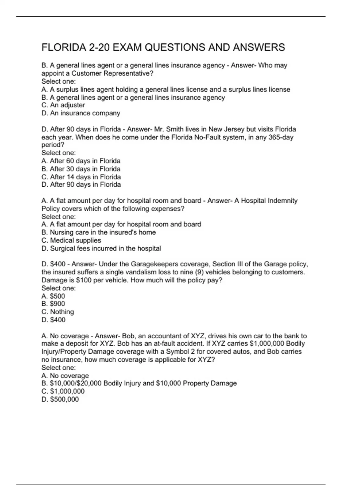 B. A general lines agent or a general lines insurance agency - Answer- Who may appoint a Customer Representative? Select one: A. A surplus lines agent holding a general lines license and a surplus lines license B. A general lines agent or a general lines insurance agency C. An adjuster D. An insurance company D. After 90 days in Florida - Answer- Mr. Smith lives in New Jersey but visits Florida each year. When does he come under the Florida No-Fault system, in any 365-day period? Select one: A. After 60 days in Florida B. After 30 days in Florida C. After 14 days in Florida D. After 90 days in Florida A. A flat amount per day for hospital room and board - Answer- A Hospital Indemnity Policy covers which of the following expenses? Select one: A. A flat amount per day for hospital room and board B. Nursing care in the insured's home C. Medical supplies D. Surgical fees incurred in the hospital D. $400 - Answer- Under the Garagekeepers coverage, Section III of the Garage policy, the insured suffers a single vandalism loss to nine (9) vehicles belonging to customers. Damage is $100 per vehicle. How much will the policy pay? Select one: A. $500 B. $900 C. Nothing D. $400 A. No coverage - Answer- Bob, an accountant of XYZ, drives his own car to the bank to make a deposit for XYZ. Bob has an at-fault accident. If XYZ carries $1,000,000 Bodily Injury/Property Damage coverage with a Symbol 2 for covered autos, and Bob carries no insurance, how much coverage is applicable for XYZ? Select one: A. No coverage B. $10,000/$20,000 Bodily Injury and $10,000 Property Damage C. $1,000,000 D. $500,000