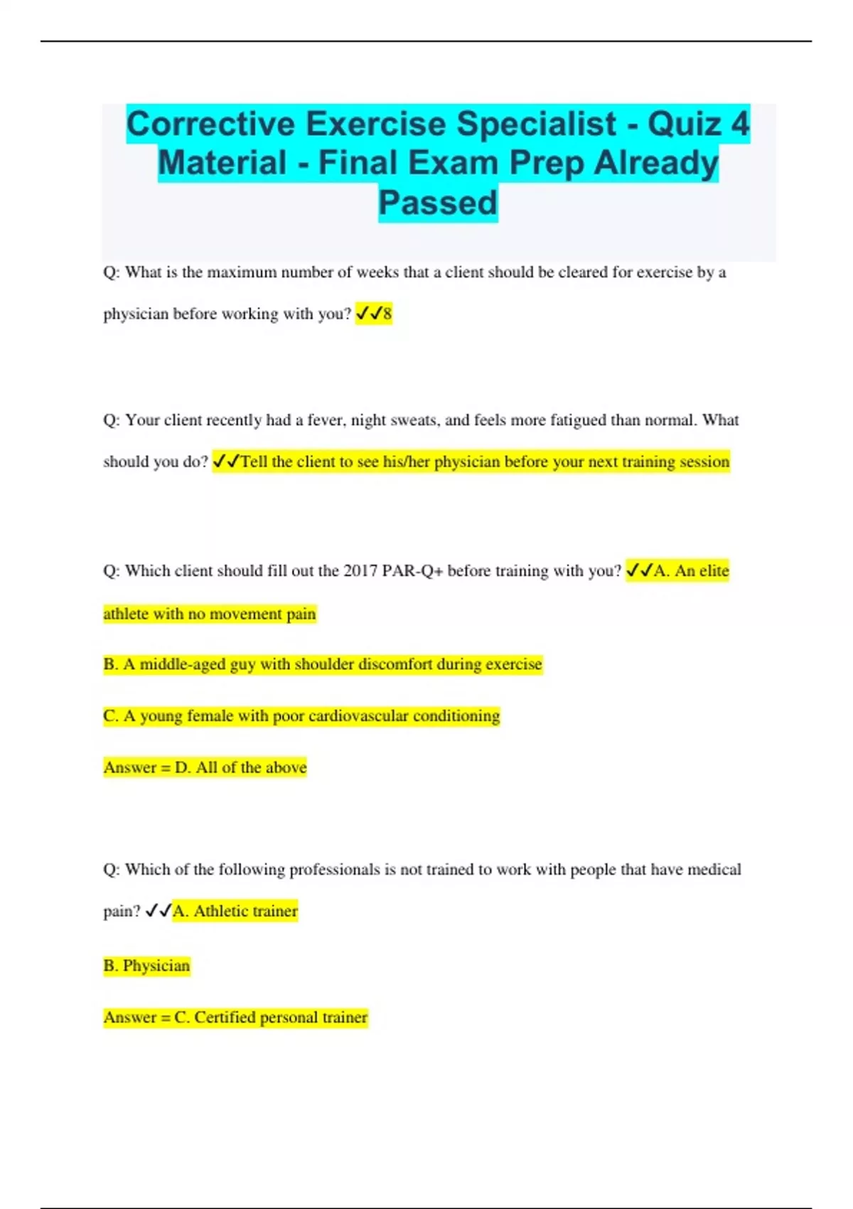 Corrective Exercise Specialist - Quiz 4 Material - Final Exam Prep Already Passed Q: What is the maximum number of weeks that a client should be cleared for exercise by a physician before working with you? 8 Q: Your client recently had a fever, night sweats, and feels more fatigued than normal. What should you do? Tell the client to see his/her physician before your next training session Q: Which client should fill out the 2017 PAR-Q+ before training with you? A. An elite athlete with no movement pain B. A middle-aged guy with shoulder discomfort during exercise C. A young female with poor cardiovascular conditioning Answer = D. All of the above Q: Which of the following professionals is not trained to work with people that have medical pain? A. Athletic trainer B. Physician Answer = C. Certified personal trainer D. Chiropractor Q: What is the type of pain that's caused by a lack of strength, mobility or motor control? Movement Pain Q: What are the two benefits of referring a client that has a potential medical problem? You'll build trust with the client and build your professional reputation Q: If a client experiences new pain during a workout, but you're pretty certain it's not a medical problem, what should you do if you're a personal trainer? Refer to a medical professional Q: A female client with knee discomfort hires you so she can return to hiking. What type of goal is she seeking? Outcome goal Q: It's important to know your client's outcome goal because it: Drives the client's behavior Q: Which type of goal should be measurable, specific and realistic? Performance goal Q: It's important to discuss a performance goal before the initial performance assessment in case you need to: Influence your client's expectations of what's realistic Q: The Pain Intensity Measurement (PIM) scale is an example of what type of measure? Outcome measure Q: Reducing a client's pain from 6/10 to 2/10 during an exercise is what type of goal? Performance goal Q: Discomfort in a joint that lasts three months is what type of pain? Chronic pain Q: What is the type of pain that lasts for a few days or a few weeks? Acute pain Q: Changes to soft tissue and motor programs typically takes how long to accomplish? Months Q: What is the final step when preparing for the first corrective exercise training session with a client? Gather quantifiable functional data Q: The type of information that can be measured or counted is known as: Quantifiable data Q: What does it mean when an outcome measure has been shown to be reliable? It is useful in a variety of populations Q: What does it mean when an outcome measure has been shown to be valid? It meets the standards of the scientific method Q: A score of 80 on the LEFS or UEFI indicates what? The client has no movement restrictions Q: What purpose(s) does the LEFS and UEFI serve? A. They inform you of the client's movement restrictions before your first session B. They serve as a way to measure progress Answer = D. Both A and B Q: When the score of the LEFS or UEFI changes enough for the client to notice a difference it's known as the: Minimum detectable change How often should your client fill out the LEFS or UEFI? Every 4 weeks Q: If a client has knee discomfort when climbing stairs, what would be an appropriate exercise to analyze during your first training session that mimics the same movement pattern? Step up Q: Everything you do during a corrective exercise session should be linked your client's: Outcome goal Q: What is the type of pain that requires intervention from a health care professional? Medical pain