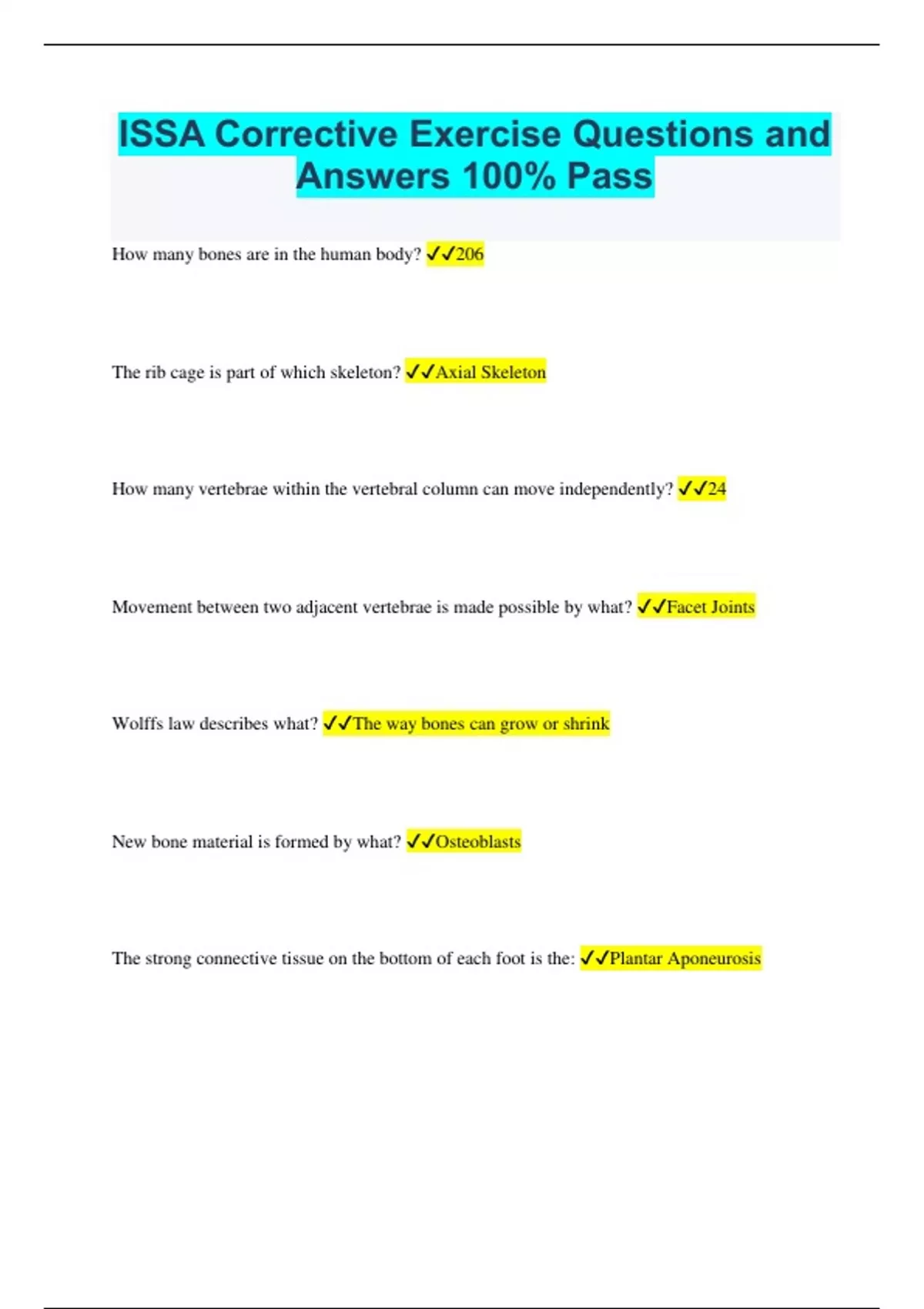 ISSA Corrective Exercise Questions and Answers 100% Pass How many bones are in the human body? 206 The rib cage is part of which skeleton? Axial Skeleton How many vertebrae within the vertebral column can move independently? 24 Movement between two adjacent vertebrae is made possible by what? Facet Joints Wolffs law describes what? The way bones can grow or shrink New bone material is formed by what? Osteoblasts The strong connective tissue on the bottom of each foot is the: Plantar Aponeurosis During the lowering phase of a biceps curl, the elbow flexors are performing which type of muscle action? Eccentric action According to Thomas Myers, how many categories a fascial lines are in the human body? Seven What are two types of sensory feedback that fascia can provide? Proprioception and pain Which of the following is not a function of skeletal muscle? Recruitment actions An eccentric muscle action occurs when? The pulling force of a muscle is less than the resistance force The primary roles of skeletal muscle are to? Contract and apply force to bones From the anatomical position, muscles origin is the position? Closest to the head What is the largest muscle in the human body? Gluteus maximus Which of the following is closest to the estimated number of muscles in the human body? 650 Skeletal muscle is a contractile tissue responsible for? Voluntary actions and reflex actions Skeletal muscle attaches to bone through a? Tendon What is the primary connective tissue that forms a tendon? Type 1 collagen Each bundle of skeletal muscle fibers, covered by a perimysium, is called a? Fascicle During a biceps curl, the biceps brachii and brachialis muscle act as? Synergists What is the primary function of a Golgi Tendon Organ Detect changes in muscle tension Which of the following is not a function required for the coordination of movement? Motivation What two types of cells make up the nervous system? Neurons and Glia What is the "transmitter" portion of a neuron that relays a signal? Axon What is the "integrator" part of a neuron that determines if there's enough information to create an action potential? Cell Body What is the name of the area, typically between two neurons or a neuron