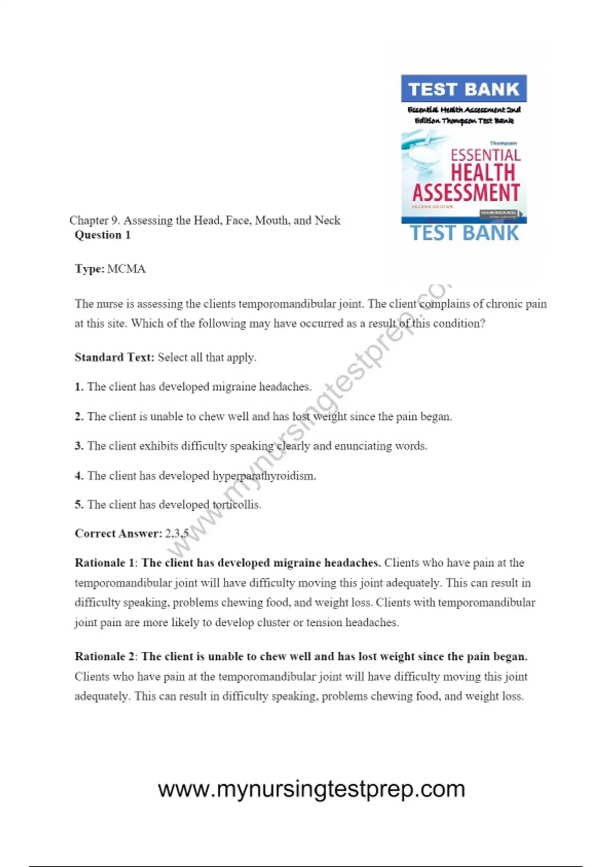 Essential Health Assessment 2nd Edition Thompson Test Bank Chapter 9. Assessing the Head, Face, Mouth, and Neck