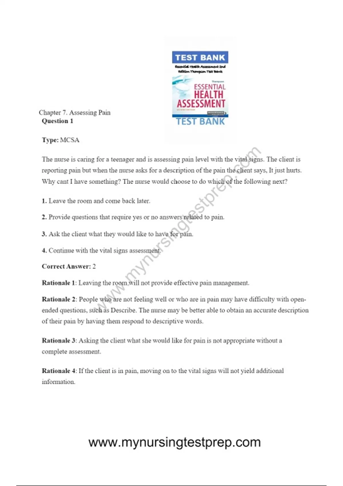Essential Health Assessment 2nd Edition Thompson Test Bank Chapter 7. Assessing Pain