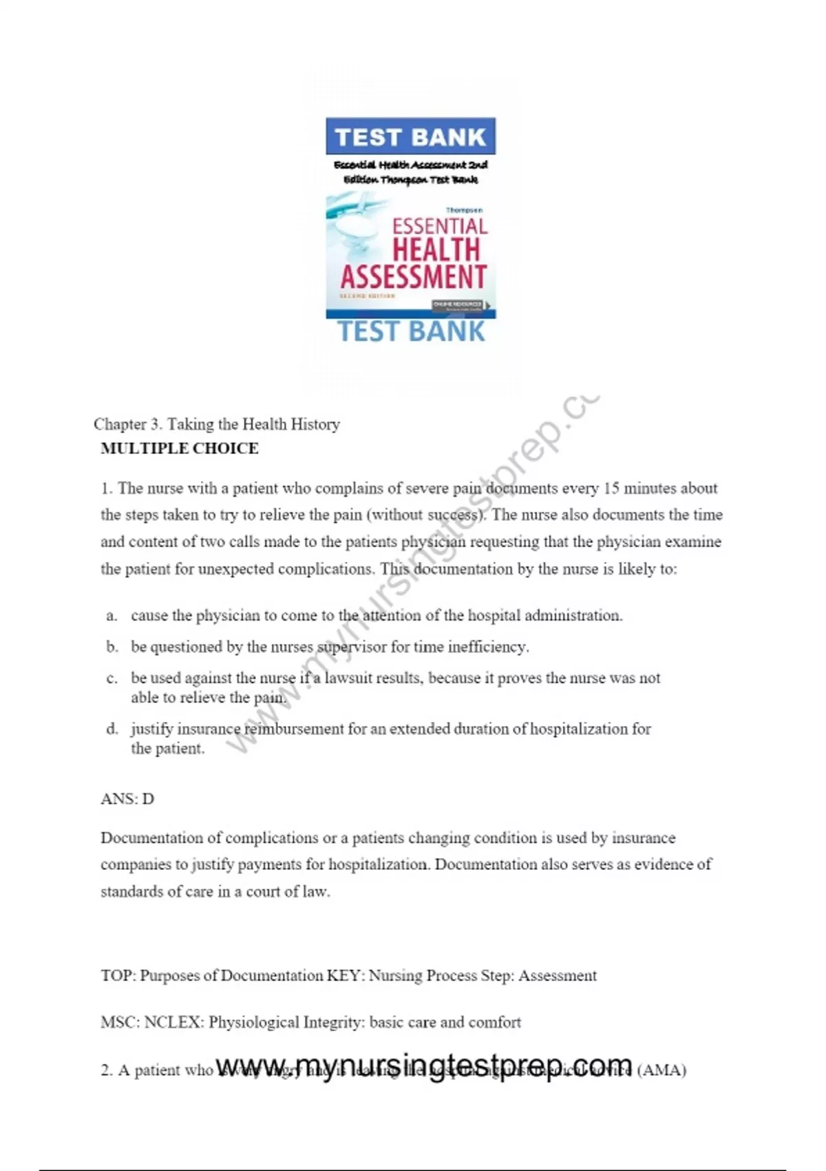 Essential Health Assessment 2nd Edition Thompson Test Bank Chapter 3. Taking the Health History