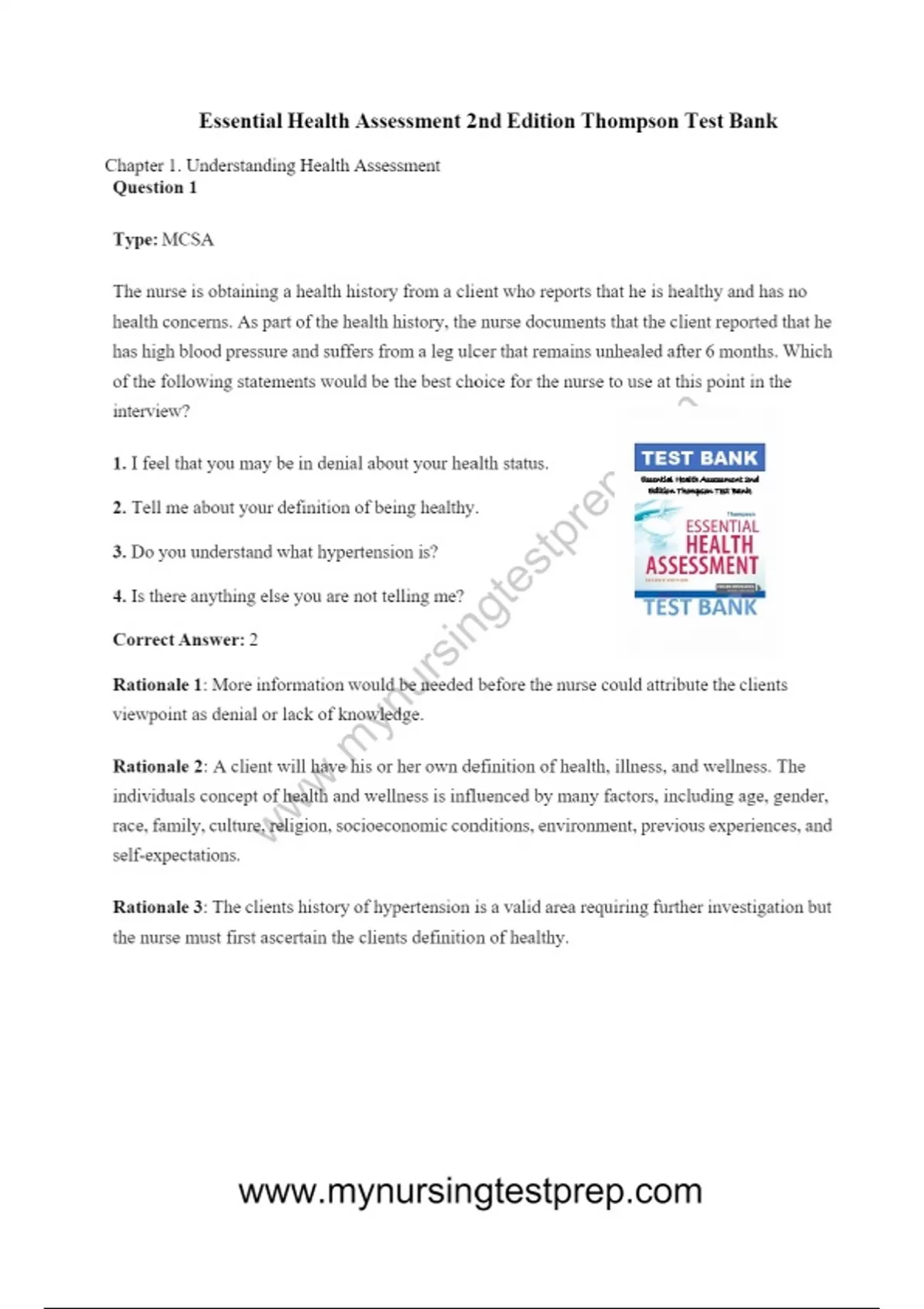 Essential Health Assessment 2nd Edition Thompson Test Bank Chapter 1. Understanding Health Assessment