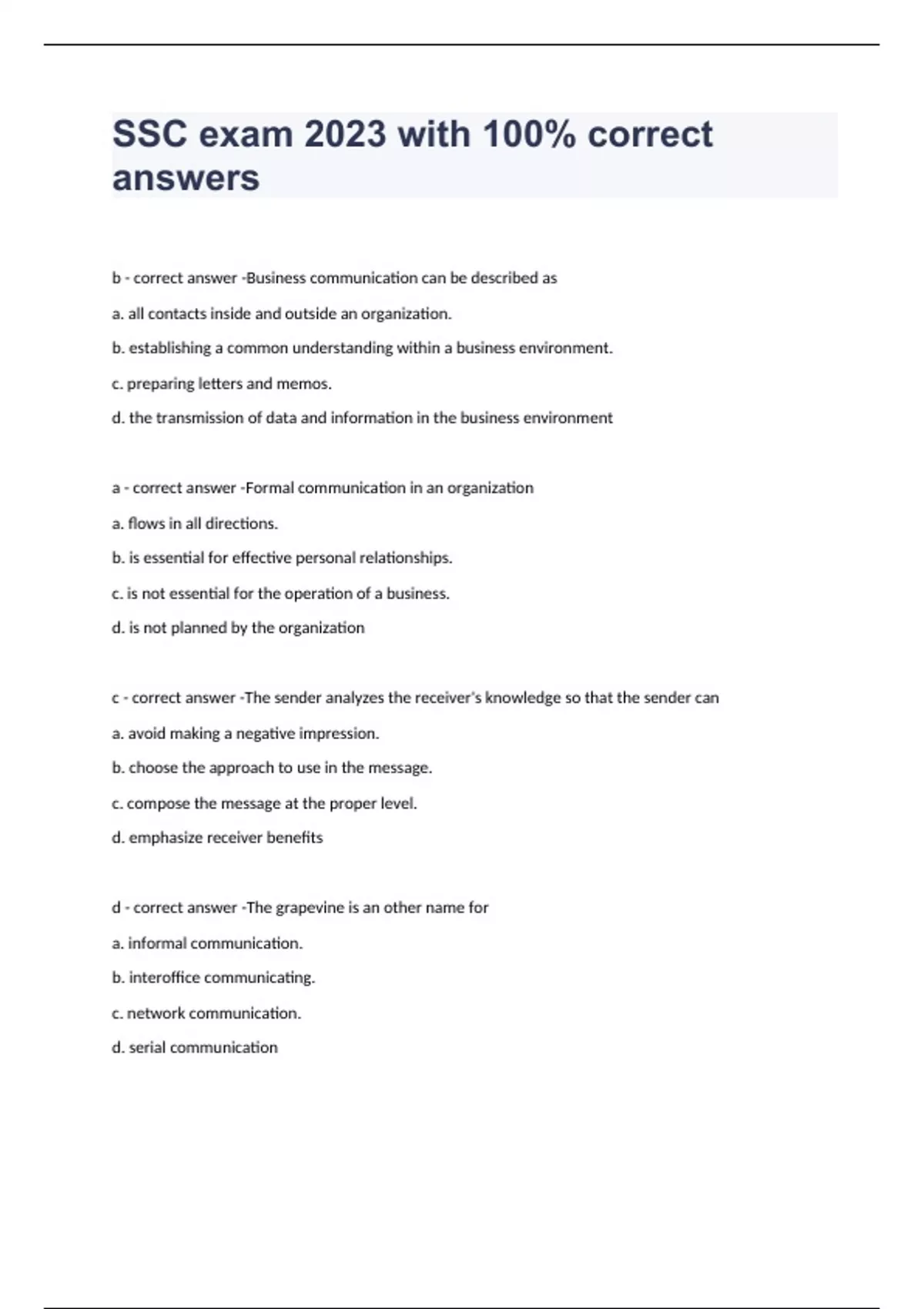 b - correct answer -Business communication can be described as a. all contacts inside and outside an organization. b. establishing a common understanding within a business environment. c. preparing letters and memos. d. the transmission of data and information in the business environment a - correct answer -Formal communication in an organization a. flows in all directions. b. is essential for effective personal relationships. c. is not essential for the operation of a business. d. is not planned by the organization c - correct answer -The sender analyzes the receiver's knowledge so that the sender can a. avoid making a negative impression. b. choose the approach to use in the message. c. compose the message at the proper level. d. emphasize receiver benefits d - correct answer -The grapevine is an other name for a. informal communication. b. interoffice communicating. c. network communication. d. serial communication a - correct answer -The casual or informal way in which English is used is known as a. colloquial language. b. conversation. c. denotation. d. slang c - correct answer -In a survey of 101 global executives, the cultural difference they considered most challenging was a. adjustment to different laws and ethics. b. workdays, workweeks, and holidays. c. communication and language. d. time, space, and power structures d - correct answer -Which of the following is NOT considered characteristic of a low-context culture? a. High value on individualism b. Focus on success and profitability c. More value placed on words than shared background d. Reliance on long-term relationships and underlying meanings a - correct answer -Among the following cultural attributes, the one(s) generally valued by the people in China