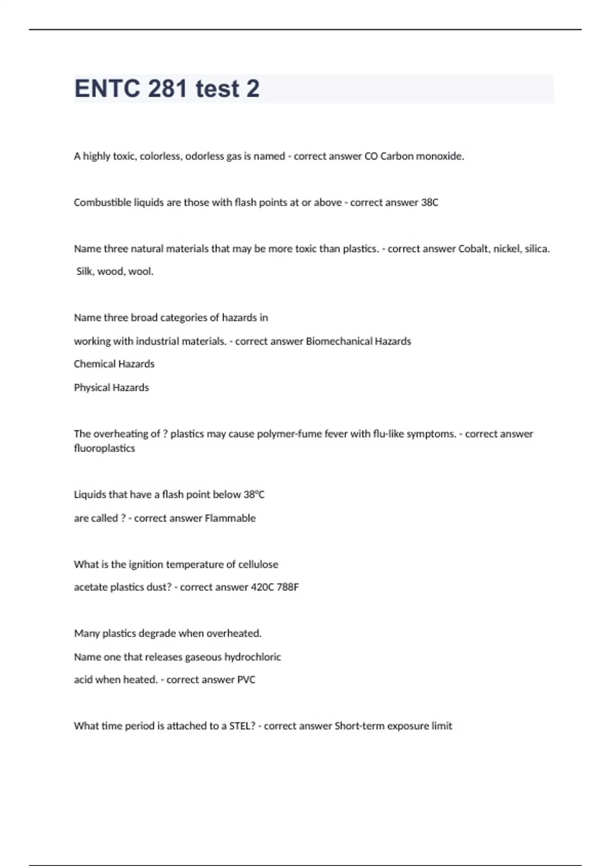 ENTC 281 test 2A highly toxic, colorless, odorless gas is named - correct answer CO Carbon monoxide. Combustible liquids are those with flash points at or above - correct answer 38C Name three natural materials that may be more toxic than plastics. - correct answer Cobalt, nickel, silica. Silk, wood, wool. Name three broad categories of hazards in working with industrial materials. - correct answer Biomechanical Hazards Chemical Hazards Physical Hazards The overheating of ? plastics may cause polymer-fume fever with flu-like symptoms. - correct answer fluoroplastics Liquids that have a flash point below 38°C are called ? - correct answer Flammable What is the ignition temperature of cellulose acetate plastics dust? - correct answer 420C 788F Many plastics degrade when overheated. Name one that releases gaseous hydrochloric acid when heated. - correct answer PVC What time period is attached to a STEL? - correct answer Short-term exposure limit