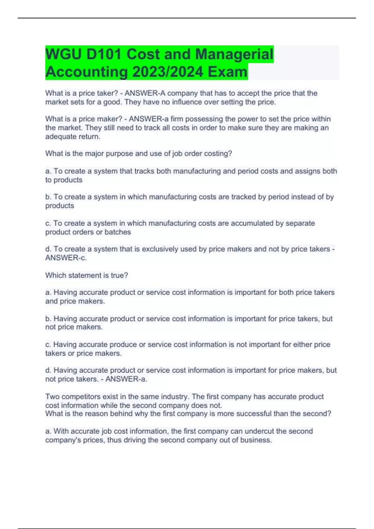 What is a price taker? - ANSWER-A company that has to accept the price that the market sets for a good. They have no influence over setting the price. What is a price maker? - ANSWER-a firm possessing the power to set the price within the market. They still need to track all costs in order to make sure they are making an adequate return. What is the major purpose and use of job order costing? a. To create a system that tracks both manufacturing and period costs and assigns both to products b. To create a system in which manufacturing costs are tracked by period instead of by products c. To create a system in which manufacturing costs are accumulated by separate product orders or batches d. To create a system that is exclusively used by price makers and not by price takers - ANSWER-c. Which statement is true? a. Having accurate product or service cost information is important for both price takers and price makers. b. Having accurate product or service cost information is important for price takers, but not price makers. c. Having accurate produce or service cost information is not important for either price takers or price makers. d. Having accurate product or service cost information is important for price makers, but not price takers. - ANSWER-a. Two competitors exist in the same industry. The first company has accurate product cost information while the second company does not. What is the reason behind why the first company is more successful than the second? a. With accurate job cost information, the first company can undercut the second company's prices, thus driving the second company out of business. b. With accurate job cost information, the first company can set prices that guarantee making a profit, can understand which costs need to be worked on, and can determine which actions can be taken to make the company more efficient and profitable. c. With accurate job cost information, the first company can pay higher wages to employees, thus motivating them more than the employees of the second company. d. With accurate job cost information, the first company can set prices higher than the second company, thus earning higher profits. - ANSWER-b. Job order costing is appropriate when which two conditions exist? a. Products produced are all the same, and the manufacturing processes used to produce them are the same. b. Products produced are distinct from each other, and the manufacturing processes used are different for different products. c. Products produced are distinct, but the manufacturing processes used are the same for different products. d. Products produced are all the same, but the manufacturing processes used to produce them are different for different products. - ANSWER-b. Why is having accurate product cost information important? a. So manufacturers can charge a price based on costs and a reasonable markup b. So companies can minimize the profits they are earning c. So manufacturers can charge a price based on estimated product costs, not including a reasonable markup d. So companies can grow faster than all competitors in their industry - ANSWER-a. Which type of company should use job order costing? a. Air filter manufacturer b. Soda bottler c. Paper towel manufacturer d. Commercial aircraft manufacturer - ANSWER-d. What is a condition to using job order costing? a. Tracking total direct materials for a given period of time