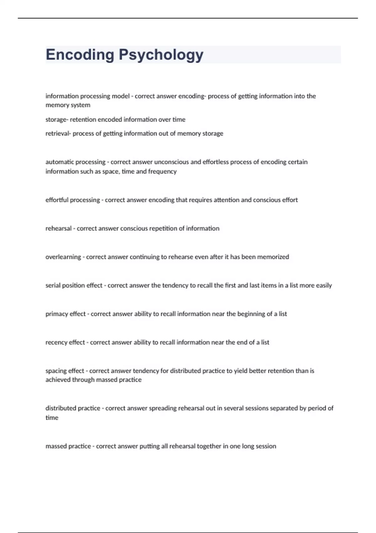 Encoding Psychologyinformation processing model - correct answer encoding- process of getting information into the memory system storage- retention encoded information over time retrieval- process of getting information out of memory storage automatic processing - correct answer unconscious and effortless process of encoding certain information such as space, time and frequency effortful processing - correct answer encoding that requires attention and conscious effort rehearsal - correct answer conscious repetition of information overlearning - correct answer continuing to rehearse even after it has been memorized serial position effect - correct answer the tendency to recall the first and last items in a list more easily primacy effect - correct answer ability to recall information near the beginning of a list recency effect - correct answer ability to recall information near the end of a list spacing effect - correct answer tendency for distributed practice to yield better retention than is achieved through massed practice distributed practice - correct answer spreading rehearsal out in several sessions separated by period of time massed practice - correct answer putting all rehearsal together in one long session