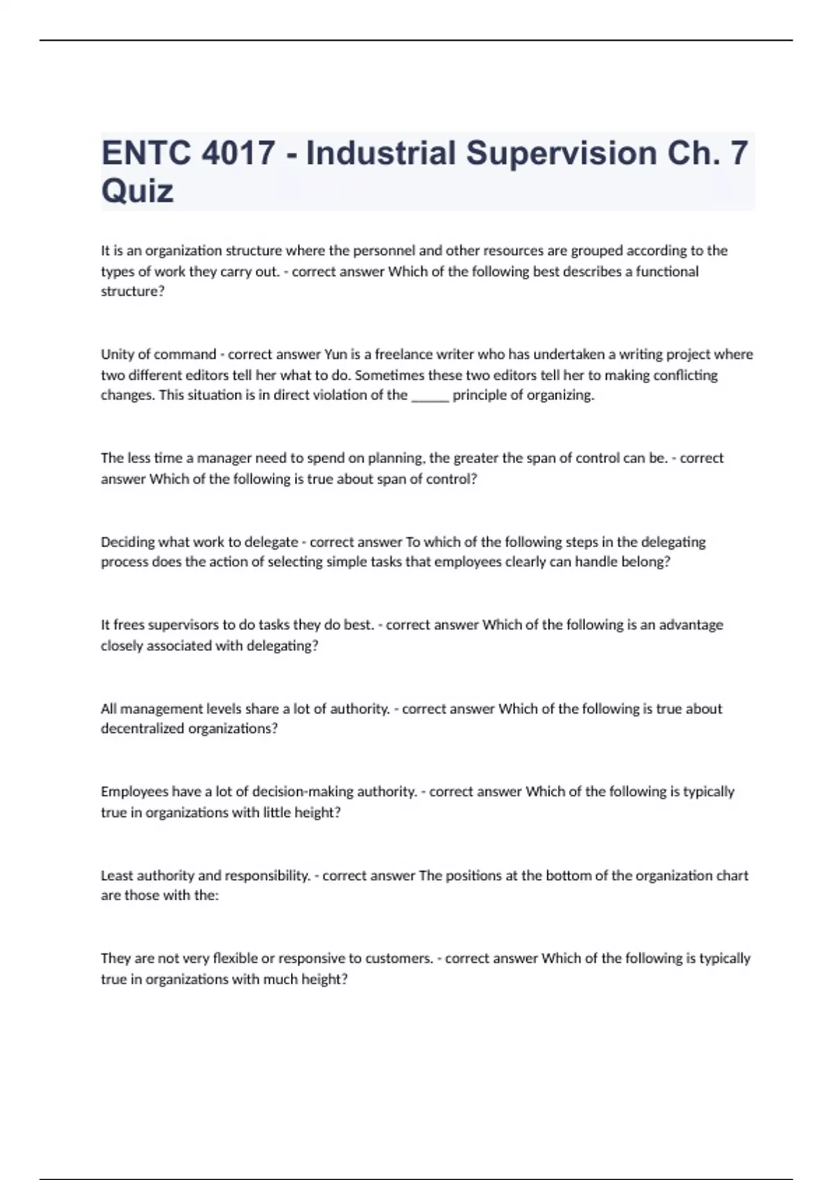 ENTC 4017 - Industrial Supervision Ch. 7 QuizIt is an organization structure where the personnel and other resources are grouped according to the types of work they carry out. - correct answer Which of the following best describes a functional structure? Unity of command - correct answer Yun is a freelance writer who has undertaken a writing project where two different editors tell her what to do. Sometimes these two editors tell her to making conflicting changes. This situation is in direct violation of the _____ principle of organizing. The less time a manager need to spend on planning, the greater the span of control can be. - correct answer Which of the following is true about span of control? Deciding what work to delegate - correct answer To which of the following steps in the delegating process does the action of selecting simple tasks that employees clearly can handle belong? It frees supervisors to do tasks they do best. - correct answer Which of the following is an advantage closely associated with delegating? All management levels share a lot of authority. - correct answer Which of the following is true about decentralized organizations? Employees have a lot of decision-making authority. - correct answer Which of the following is typically true in organizations with little height? Least authority and responsibility. - correct answer The positions at the bottom of the organization chart are those with the: They are not very flexible or responsive to customers. - correct answer Which of the