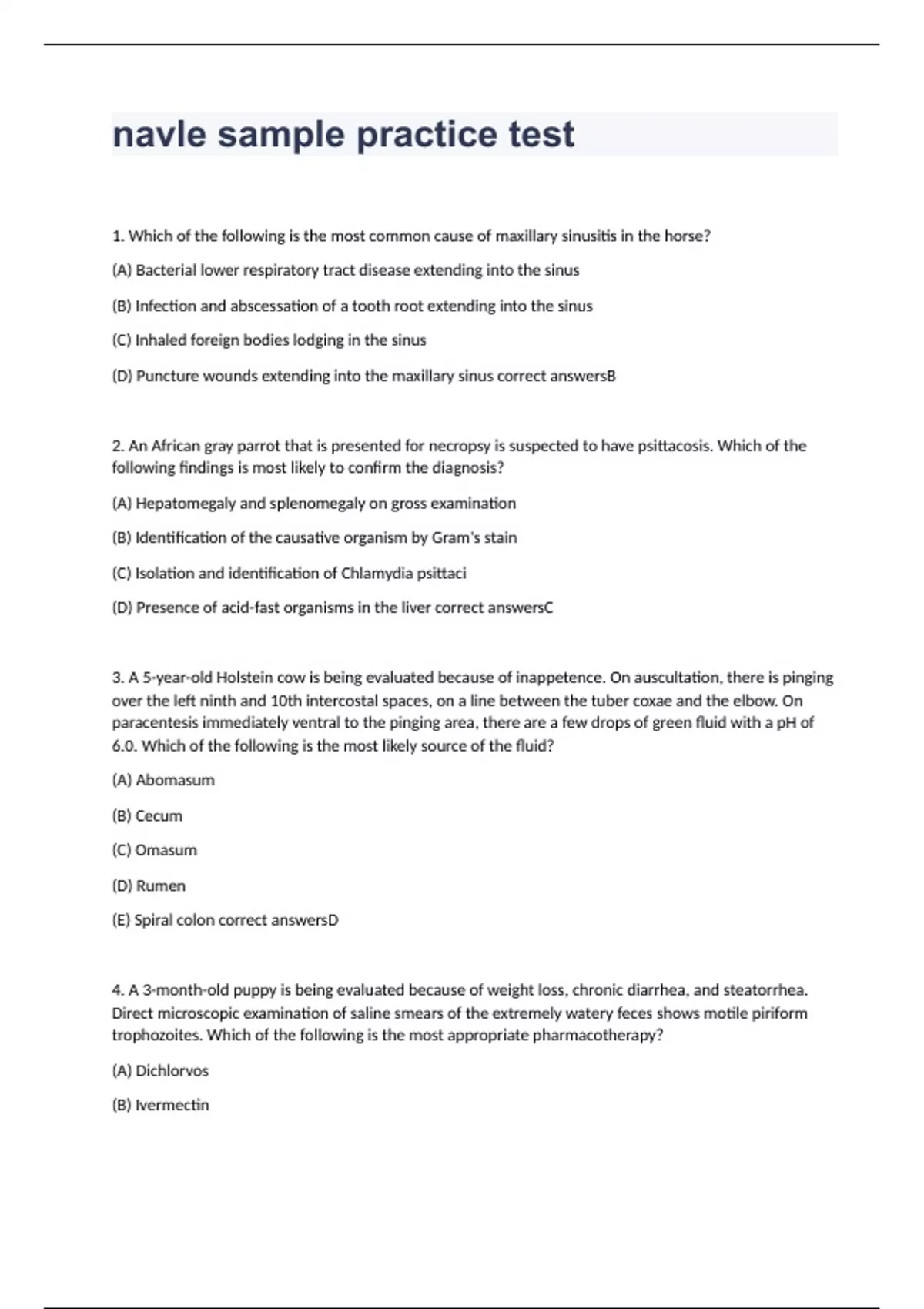 1. Which of the following is the most common cause of maxillary sinusitis in the horse? (A) Bacterial lower respiratory tract disease extending into the sinus (B) Infection and abscessation of a tooth root extending into the sinus (C) Inhaled foreign bodies lodging in the sinus (D) Puncture wounds extending into the maxillary sinus correct answersB 2. An African gray parrot that is presented for necropsy is suspected to have psittacosis. Which of the following findings is most likely to confirm the diagnosis? (A) Hepatomegaly and splenomegaly on gross examination (B) Identification of the causative organism by Gram's stain (C) Isolation and identification of Chlamydia psittaci (D) Presence of acid-fast organisms in the liver correct answersC 3. A 5-year-old Holstein cow is being evaluated because of inappetence. On auscultation, there is pinging over the left ninth and 10th intercostal spaces, on a line between the tuber coxae and the elbow. On paracentesis immediately ventral to the pinging area, there are a few drops of green fluid with a pH of 6.0. Which of the following is the most likely source of the fluid? (A) Abomasum (B) Cecum (C) Omasum (D) Rumen (E) Spiral colon correct answersD 4. A 3-month-old puppy is being evaluated because of weight loss, chronic diarrhea, and steatorrhea. Direct microscopic examination of saline smears of the extremely watery feces shows motile piriform trophozoites. Which of the following is the most appropriate pharmacotherapy? (A) Dichlorvos (B) Ivermectin