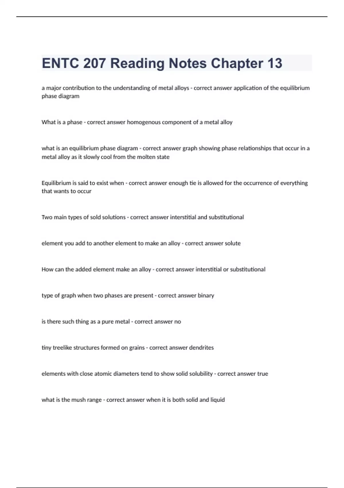 ENTC 207 Reading Notes Chapter 13a major contribution to the understanding of metal alloys - correct answer application of the equilibrium phase diagram What is a phase - correct answer homogenous component of a metal alloy what is an equilibrium phase diagram - correct answer graph showing phase relationships that occur in a metal alloy as it slowly cool from the molten state Equilibrium is said to exist when - correct answer enough tie is allowed for the occurrence of everything that wants to occur Two main types of sold solutions - correct answer interstitial and substitutional element you add to another element to make an alloy - correct answer solute How can the added element make an alloy - correct answer interstitial or substitutional type of graph when two phases are present - correct answer binary is there such thing as a pure metal - correct answer no tiny treelike structures formed on grains - correct answer dendrites elements with close atomic diameters tend to show solid solubility - correct answer true what is the mush range - correct answer when it is both solid and liquid what is a eutectic metal - correct answer easy melting alloy that has a single melting point composition of iron and carbon that coincides with the transformation from one type of solid to another type of solid - correct answer eutectoid point resulting structure of a eutectoid composition - correct answer pearlite What are inter metallic compounds - correct answer two metals that chemically combine to form a chemical compound with a definite ratio of one element to the other compound that forms in most steels - correct answer Fe3C aka iron carbide diagrams for alloys containing three major elements - correct answer ternary diagrams for alloys containing four major elements - correct answer quaternary what is a tie line/isotherm - correct answer a horizontal line going from a temperature to a point on the phase diagram what are phase relationship calculation - correct answer lever law calculations lever law calculations are an aid to the metallurgist in predicting - correct answer microstructures a steel is an alloy of carbon and iron when - correct answer carbon is within .06% and 2% What is ferrite - correct answer low carbon content BCC iron with carbon in solid solution What are the characteristics of ferrite - correct answer soft, ductile, magnetic What is austenite - correct answer high carbon content FCC iron with carbon in solid solution