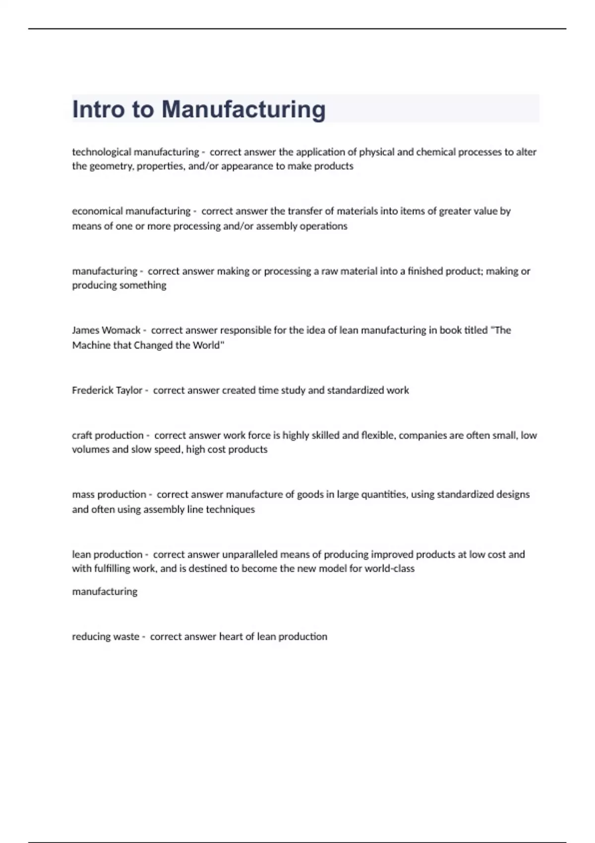 Intro to Manufacturingtechnological manufacturing - correct answer the application of physical and chemical processes to alter the geometry, properties, and/or appearance to make products economical manufacturing - correct answer the transfer of materials into items of greater value by means of one or more processing and/or assembly operations manufacturing - correct answer making or processing a raw material into a finished product; making or producing something James Womack - correct answer responsible for the idea of lean manufacturing in book titled "The Machine that Changed the World" Frederick Taylor - correct answer created time study and standardized work craft production - correct answer work force is highly skilled and flexible, companies are often small, low volumes and slow speed, high cost products mass production - correct answer manufacture of goods in large quantities, using standardized designs and often using assembly line techniques lean production - correct answer unparalleled means of producing improved products at low cost and with fulfilling work, and is destined to become the new model for world-class manufacturing reducing waste - correct answer heart of lean production