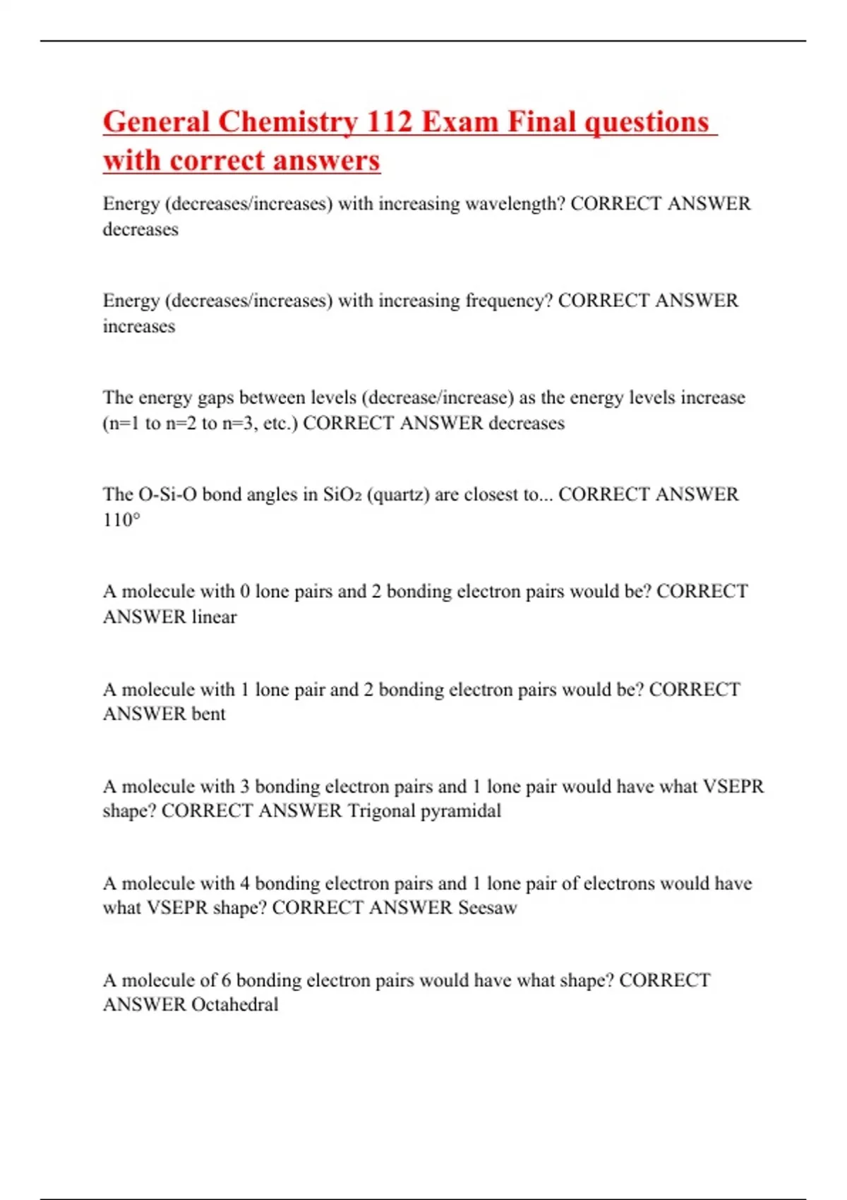 Energy (decreases/increases) with increasing wavelength? CORRECT ANSWER decreases Energy (decreases/increases) with increasing frequency? CORRECT ANSWER increases The energy gaps between levels (decrease/increase) as the energy levels increase (n=1 to n=2 to n=3, etc.) CORRECT ANSWER decreases The O-Si-O bond angles in SiO₂ (quartz) are closest to... CORRECT ANSWER 110° A molecule with 0 lone pairs and 2 bonding electron pairs would be? CORRECT ANSWER linear A molecule with 1 lone pair and 2 bonding electron pairs would be? CORRECT ANSWER bent A molecule with 3 bonding electron pairs and 1 lone pair would have what VSEPR shape? CORRECT ANSWER Trigonal pyramidal A molecule with 4 bonding electron pairs and 1 lone pair of electrons would have what VSEPR shape? CORRECT ANSWER Seesaw A molecule of 6 bonding electron pairs would have what shape? CORRECT ANSWER Octahedral