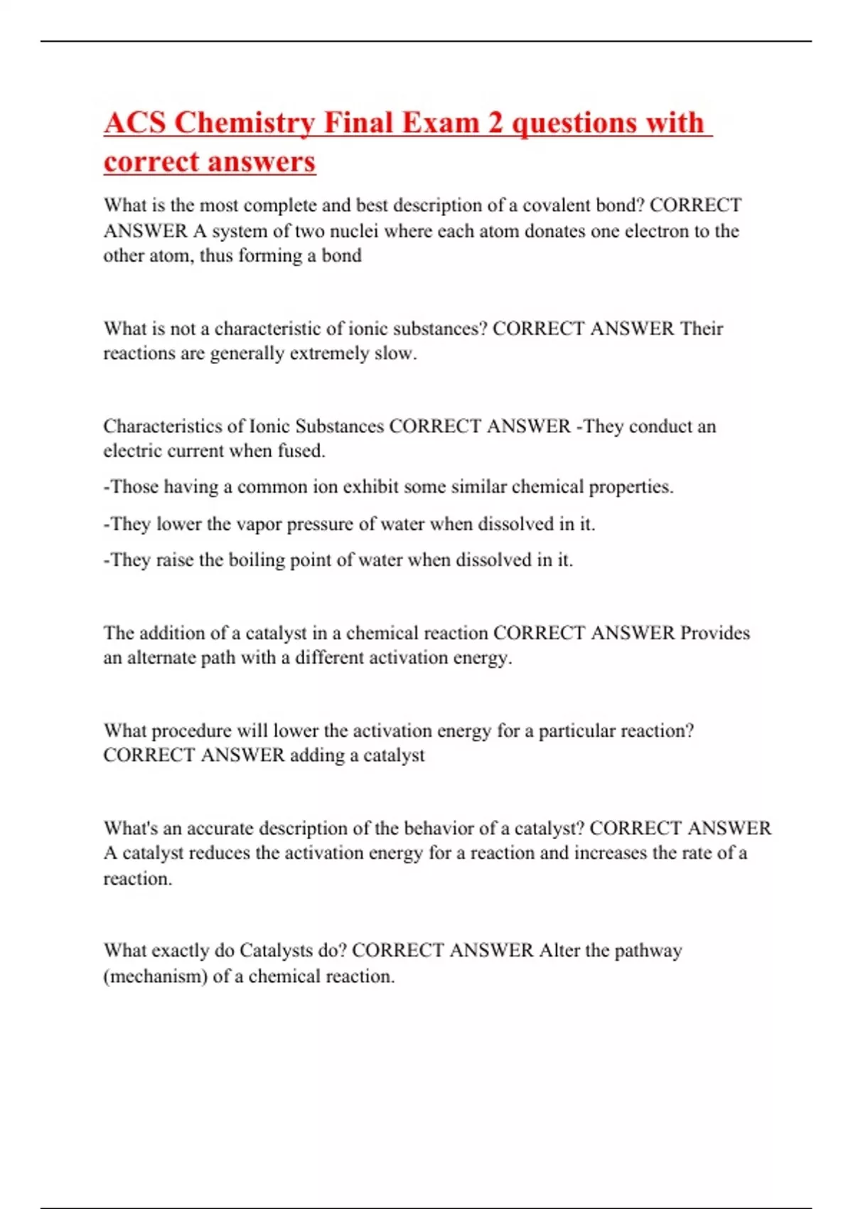 What is the most complete and best description of a covalent bond? CORRECT ANSWER A system of two nuclei where each atom donates one electron to the other atom, thus forming a bond What is not a characteristic of ionic substances? CORRECT ANSWER Their reactions are generally extremely slow. Characteristics of Ionic Substances CORRECT ANSWER -They conduct an electric current when fused. -Those having a common ion exhibit some similar chemical properties. -They lower the vapor pressure of water when dissolved in it. -They raise the boiling point of water when dissolved in it. The addition of a catalyst in a chemical reaction CORRECT ANSWER Provides an alternate path with a different activation energy. What procedure will lower the activation energy for a particular reaction? CORRECT ANSWER adding a catalyst What's an accurate description of the behavior of a catalyst? CORRECT ANSWER A catalyst reduces the activation energy for a reaction and increases the rate of a reaction. What exactly do Catalysts do? CORRECT ANSWER Alter the pathway (mechanism) of a chemical reaction.