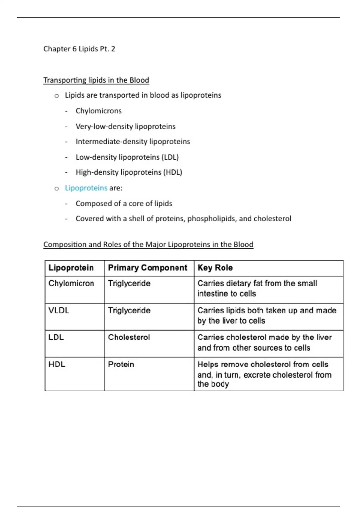 Provides in depth concepts of transporting lipids in the blood, lipoprotein structure and composition, transporting dietary lipids using chylomicrons, transporting lipids using VLDL, LDL and HDL, LDL removal from blood, Receptor pathway for cholesterol uptake, HDL in removing LDL from blood, health conerns related to fat intake, diets high in total fat
