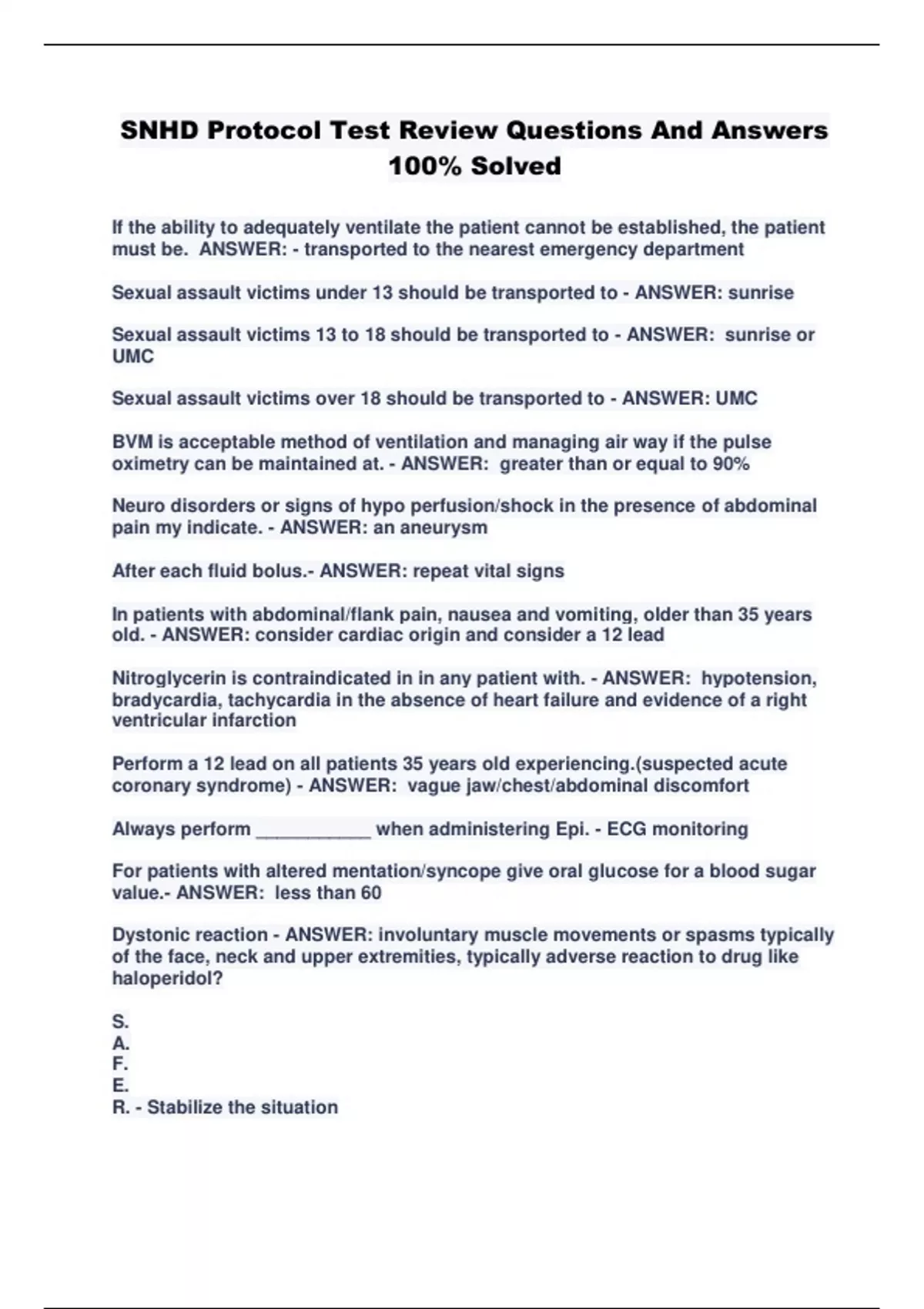 SNHD Protocol Test Review Questions And Answers 100% Solved