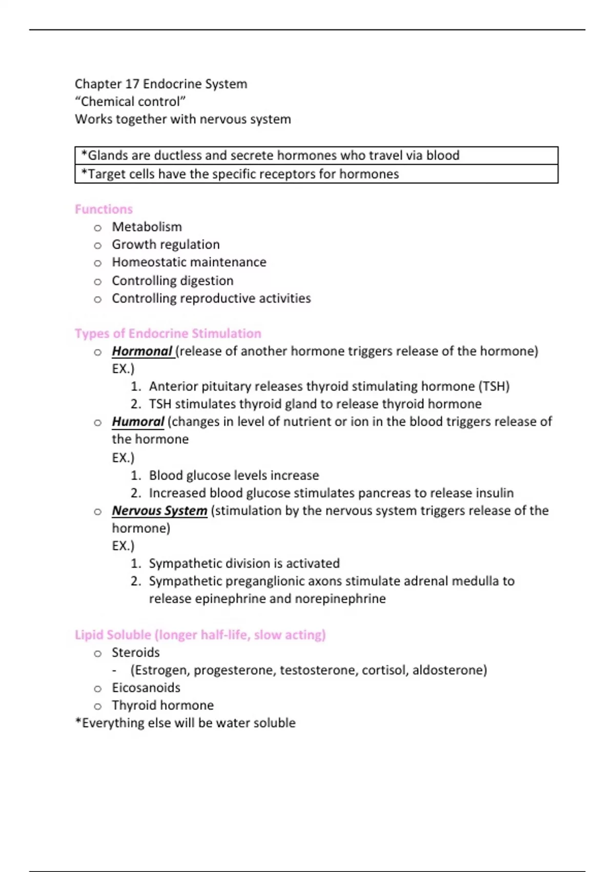 In depth concept of functions of the endocrine system, types of endocrine stimulation, lipid soluble hormones, circulating hormones, local hormones, transport in the blood, levels of circulating hormone, water soluble hormones, up regualtion, down regulation, anterior vs posterior pituitary, effects of growth hormone, effects of thyroid hormone, effetcs of calcitonin, adrenal glands, adrenal cortex, cortisol, pancreas, pineal gland, parathyroid gland.