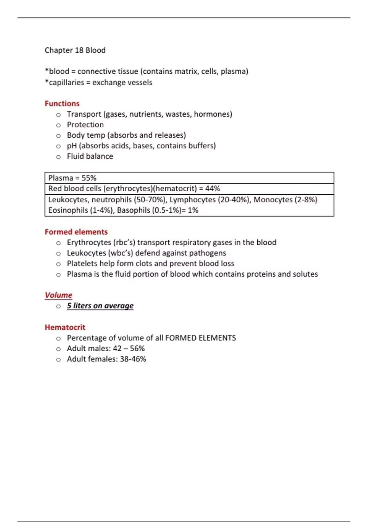 In depth concepts of functions of the blood, formed elements,ments, volume, hematocrit, composition of blood plasma, hempoiesis, erthropoiesis, erythrocytes, leukopoiesis, leukocytes, thrombopoiesis, thrombocytes, hemoglobin, blood types, rH comparability, 5 types of leukocytes, platelets, hemostasis, coagulation cascade.
