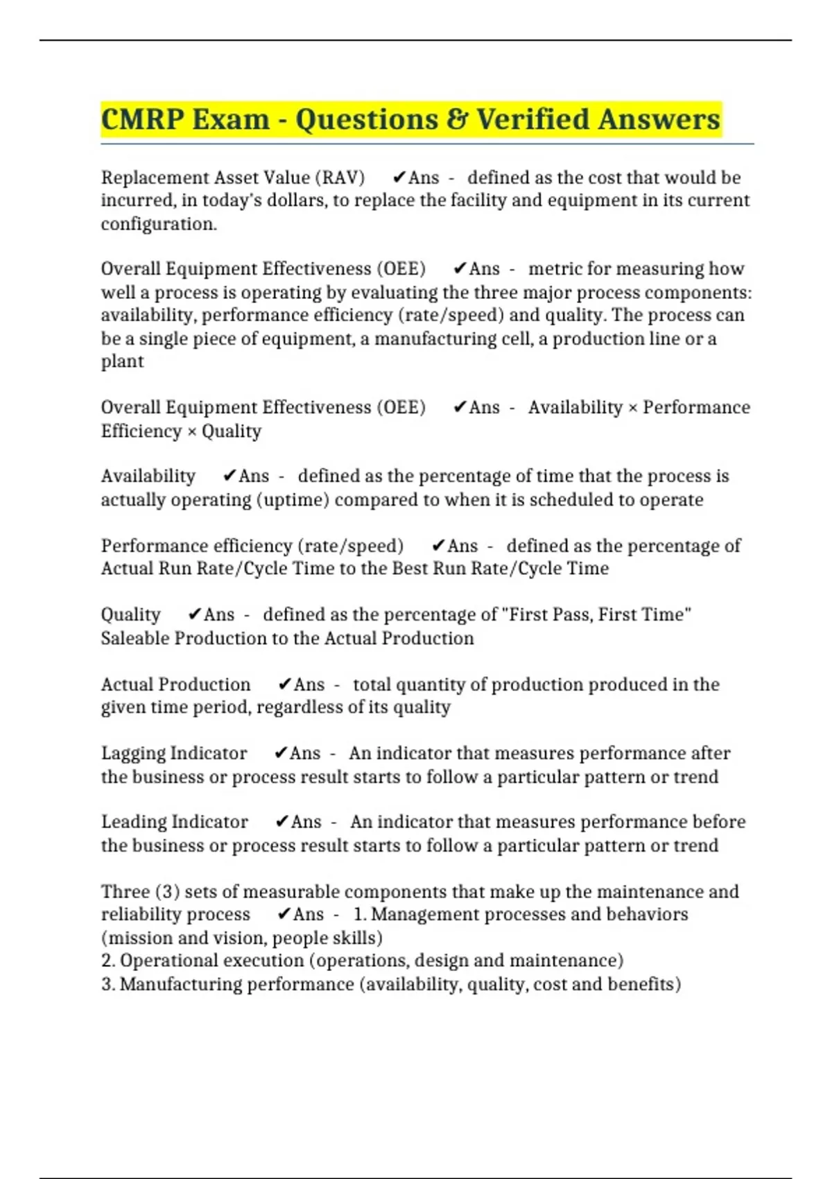 Overall Equipment Effectiveness (OEE) ✔️Ans - Availability × Performance