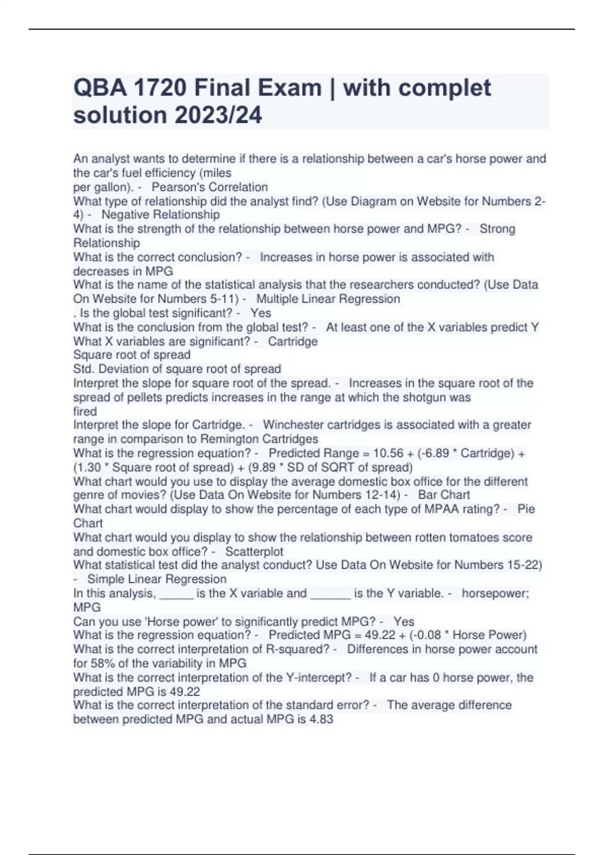 QBA 1720 Final Exam | with complet solution 2023/24 An analyst wants to determine if there is a relationship between a car's horse power and the car's fuel efficiency (miles per gallon). - Pearson's Correlation What type of relationship did the analyst find? (Use Diagram on Website for Numbers 2-4) - Negative Relationship What is the strength of the relationship between horse power and MPG? - Strong Relationship What is the correct conclusion? - Increases in horse power is associated with decreases in MPG What is the name of the statistical analysis that the researchers conducted? (Use Data On Website for Numbers 5-11) - Multiple Linear Regression . Is the global test significant? - Yes What is the conclusion from the global test? - At least one of the X variables predict Y What X variables are significant? - Cartridge Square root of spread Std. Deviation of square root of spread Interpret the slope for square root of the spread. - Increases in the square root of the spread of pellets predicts increases in the range at which the shotgun was fired Interpret the slope for Cartridge. - Winchester cartridges is associated with a greater range in comparison to Remington Cartridges What is the regression equation? - Predicted Range = 10.56 + (-6.89 * Cartridge) + (1.30 * Square root of spread) + (9.89 * SD of SQRT of spread) What chart would you use to display the average domestic box office for the different genre of movies? (Use Data On Website for Numbers 12-14) - Bar Chart What chart would display to show the percentage of each type of MPAA rating? - Pie Chart What chart would you display to show the relationship between rotten tomatoes score and domestic box office? - Scatterplot What statistical test did the analyst conduct? Use Data On Website for Numbers 15-22) - Simple Linear Regression In this analysis, _____ is the X variable and ______ is the Y variable. - horsepower; MPG Can you use 'Horse power' to significantly predict MPG? - Yes What is the regression equation? - Predicted MPG = 49.22 + (-0.08 * Horse Power) What is the correct interpretation of R-squared? - Differences in horse power account for 58% of the variability in MPG What is the correct interpretation of the Y-intercept? - If a car has 0 horse power, the predicted MPG is 49.22 What is the correct interpretation of the standard error? - The average difference between predicted MPG and actual MPG is 4.83