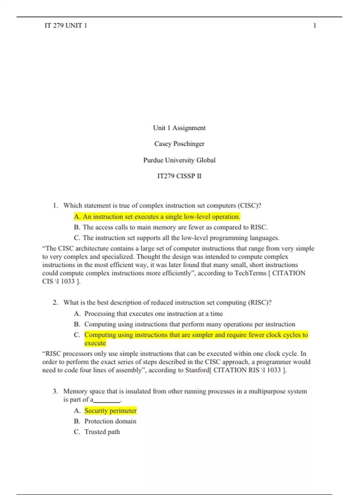 IT 279 UNIT 1 ASSIGNMENT 2 1. Which statement is true of complex instruction set computers (CISC)? A. An instruction set executes a single low-level operation. B. The access calls to main memory are fewer as compared to RISC. C. The instruction set supports all the low-level programming languages. “The CISC architecture contains a large set of computer instructions that range from very simple to very complex and specialized. Thought the design was intended to compute complex instructions in the most efficient way, it was later found that many small, short instructions could compute complex instructions more efficiently”, according to TechTerms [ CITATION CIS l 1033 ]. 2. What is the best description of reduced instruction set computing (RISC)? A. Processing that executes one instruction at a time B. Computing using instructions that perform many operations per instruction C. Computing using instructions that are simpler and require fewer clock cycles to execute “RISC processors only use simple instructions that can be executed within one clock cycle. In order to perform the exact series of steps described in the CISC approach, a programmer would need to code four lines of assembly”, according to Stanford[ CITATION RIS l 1033 ]. 3. Memory space that is insulated from other running processes in a multipurpose system is part of a _________. A. Security perimeter B. Protection domain C. Trusted path “The security perimeter of your system is an imaginary boundary that separates the TCB from the reset of the system. This boundary ensures that no insecure communications or interactions occur between the TCB and the remaining elements of the computer system”, according to the CISSP: Certified Information Systems Security Professional Official Study Guide [CITATION Cha18 p 283 l 1033 ]. 4. What is the best description of an execution domain? A. Memory space insulated from other running processes in a multiprocessing system. B. A communication channel between an application and the kernel in the TCB. C. An isolated area that is used by trusted processes when they are run in privileged state. “A program that resides in a privileged domain needs to be able to execute its instructions and process its data with the assurance that programs in a different domain cannot negatively affect