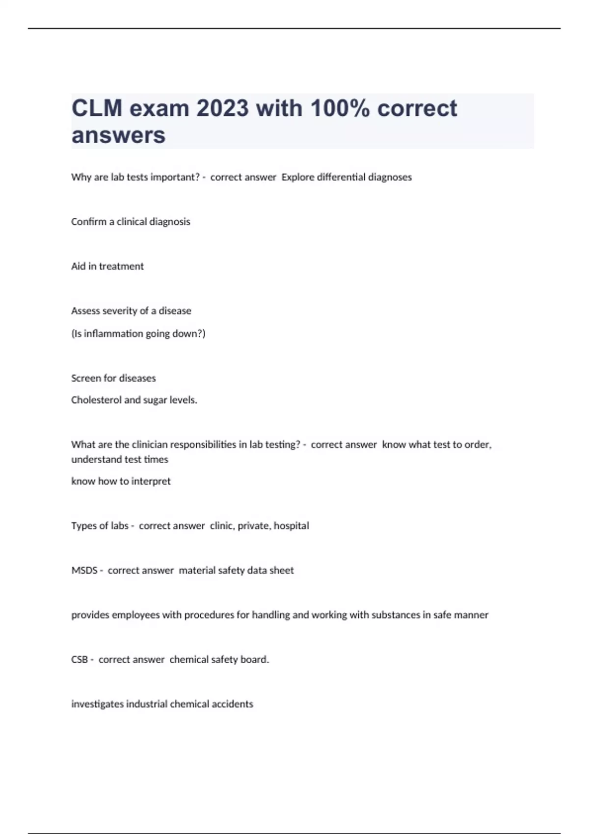 Why are lab tests important? - correct answer Explore differential diagnoses Confirm a clinical diagnosis Aid in treatment Assess severity of a disease (Is inflammation going down?) Screen for diseases Cholesterol and sugar levels. What are the clinician responsibilities in lab testing? - correct answer know what test to order, understand test times know how to interpret Types of labs - correct answer clinic, private, hospital MSDS - correct answer material safety data sheet provides employees with procedures for handling and working with substances in safe manner CSB - correct answer chemical safety board. investigates industrial chemical accidents