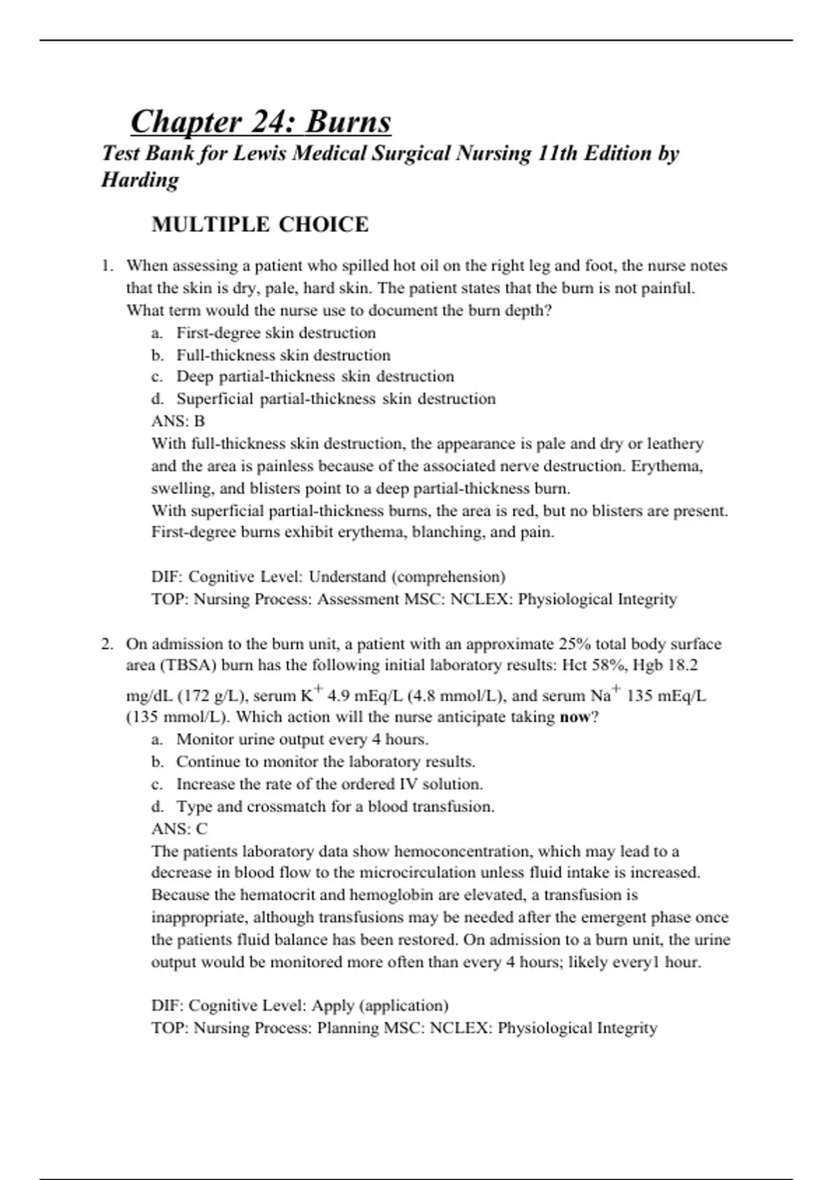 24. Chapter 24: Burns Test Bank for Lewis Medical Surgical Nursing 11th Edition by Harding