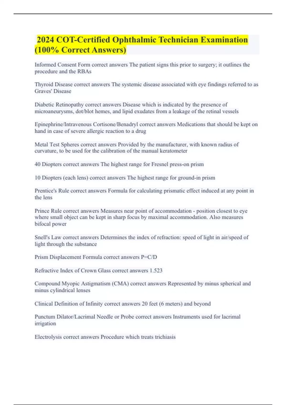 2024 COT-Certified Ophthalmic Technician Examination (100% Correct Answers)