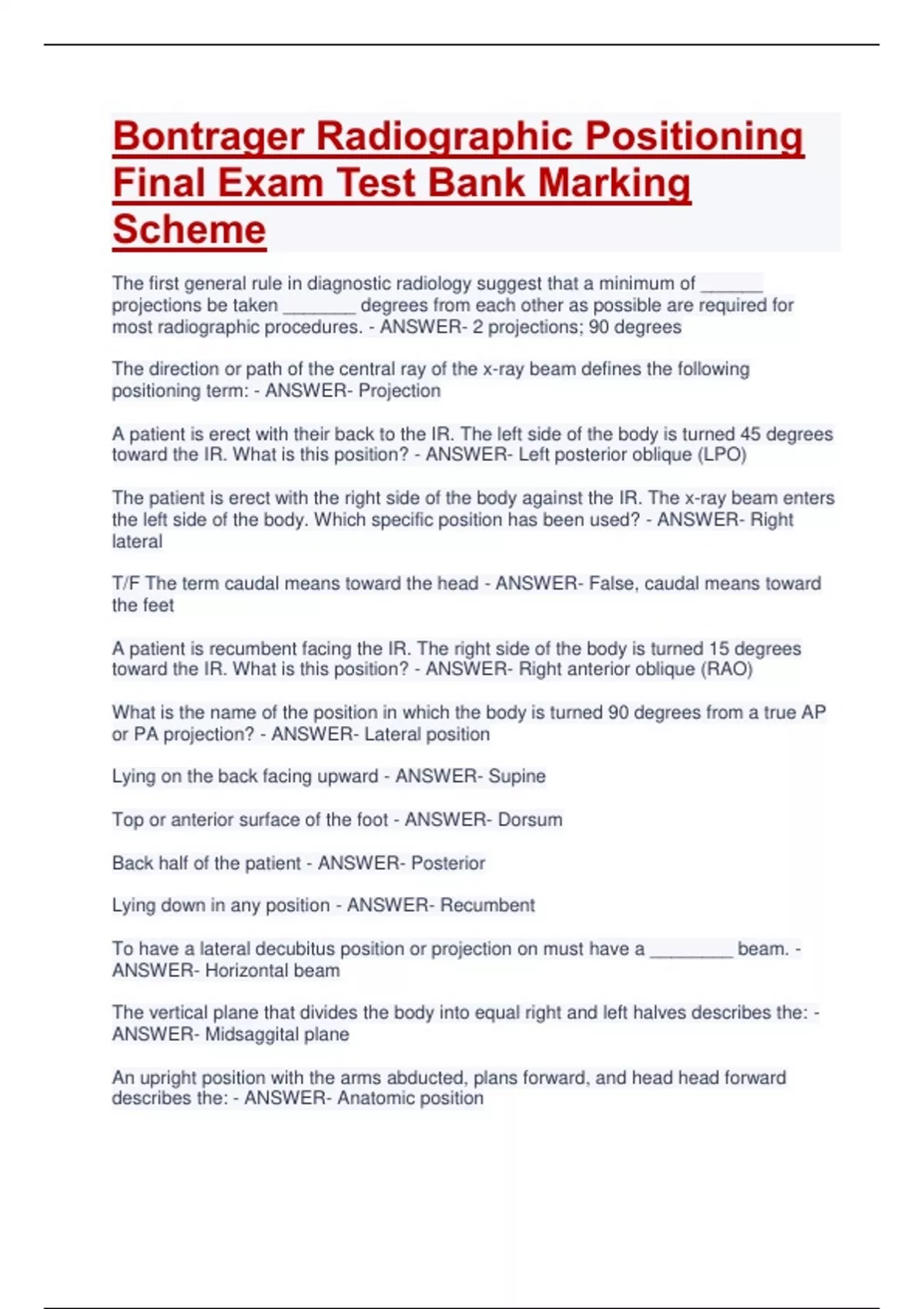 Bontrager Radiographic Positioning Final Exam Test Bank Marking Scheme