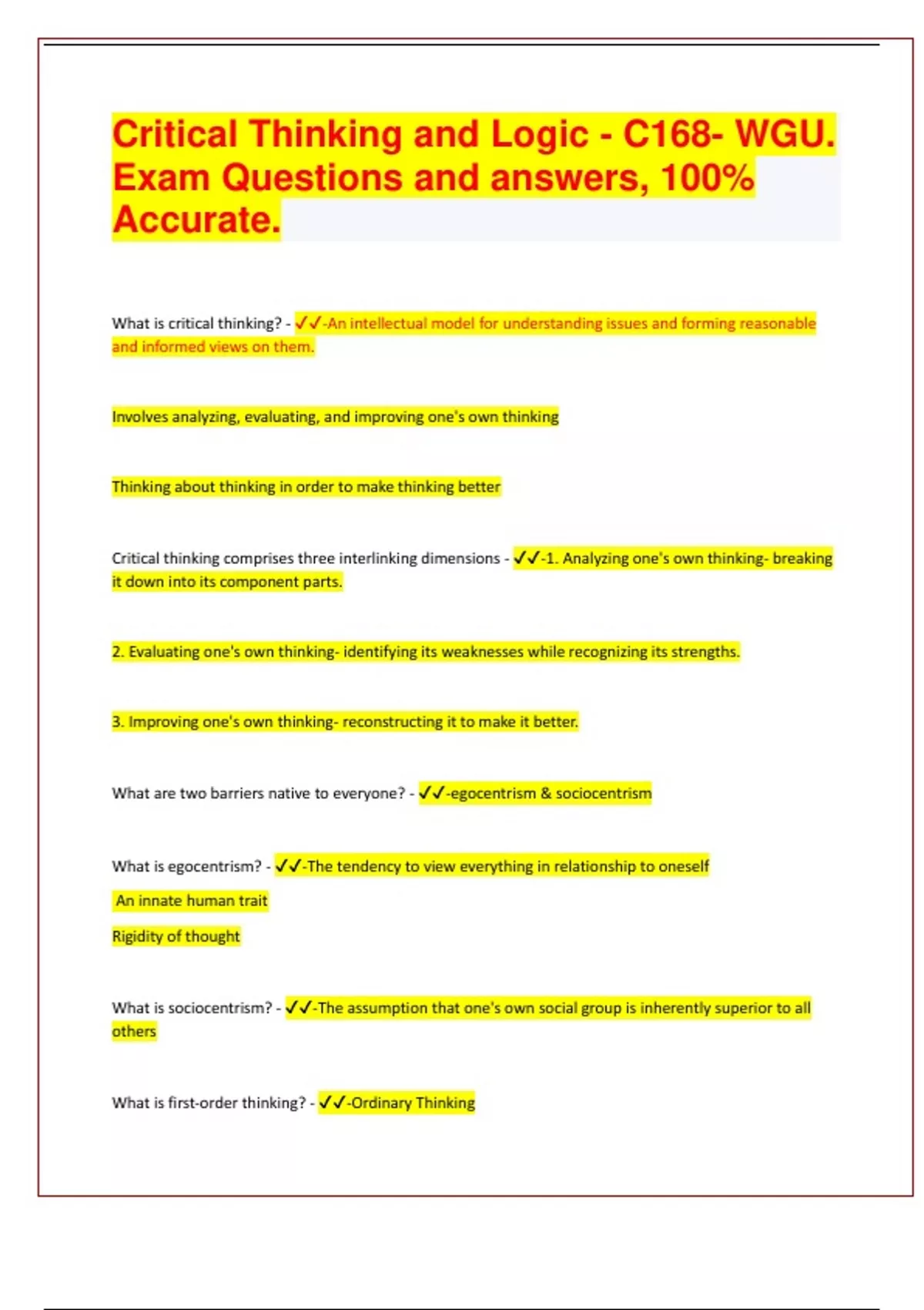 Critical Thinking and Logic - C168- WGU. Exam Questions and answers, 100% Accurate 2024
