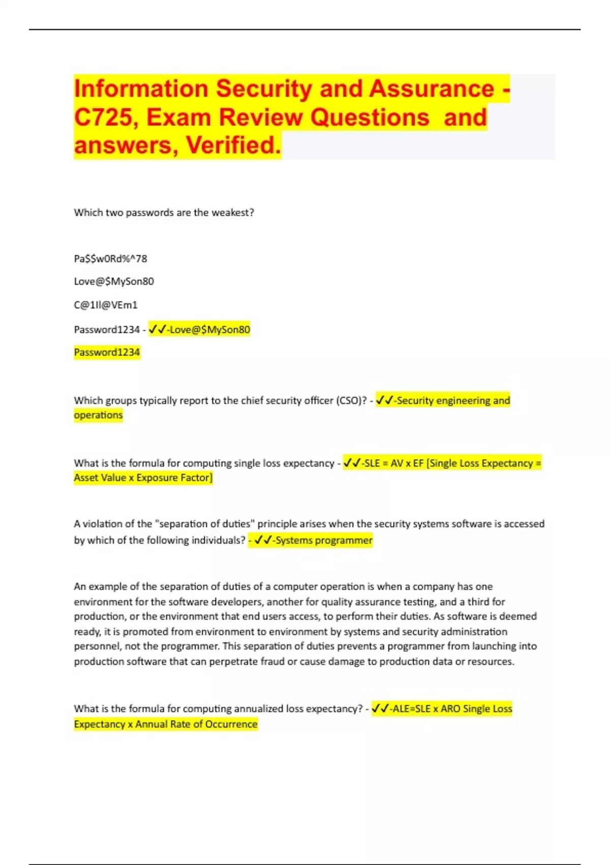 Which two passwords are the weakest? Pa$$w0Rd%^78 Love@$MySon80 C@1Il@VEm1 Password1234 - -Love@$MySon80 Password1234 Which groups typically report to the chief security officer (CSO)? - -Security engineering and operations What is the formula for computing single loss expectancy - -SLE = AV x EF [Single Loss Expectancy = Asset Value x Exposure Factor] A violation of the "separation of duties" principle arises when the security systems software is accessed by which of the following individuals? - -Systems programmer An example of the separation of duties of a computer operation is when a company has one environment for the software developers, another for quality assurance testing, and a third for production, or the environment that end users access, to perform their duties. As software is deemed ready, it is promoted from environment to environment by systems and security administration personnel, not the programmer. This separation of duties prevents a programmer from launching into production software that can perpetrate fraud or cause damage to production data or resources. What is the formula for computing annualized loss expectancy? - -ALE=SLE x ARO Single Loss Expectancy x Annual Rate of OccurrenceWhat is the first thing you should do when a disaster Strikes? - -Ensure the people are safe