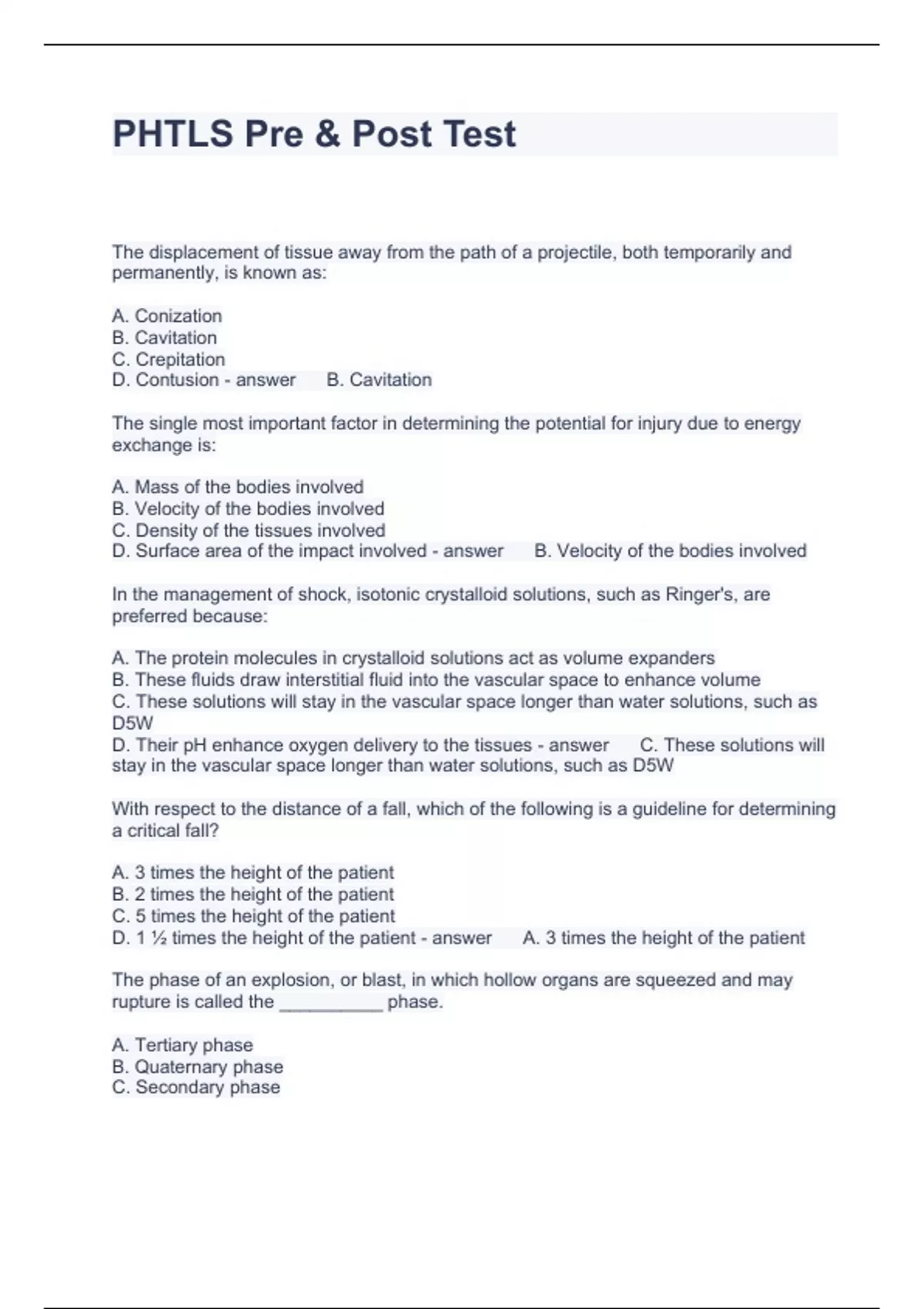 PHTLS Pre Questions and Answers Fully solved 2023