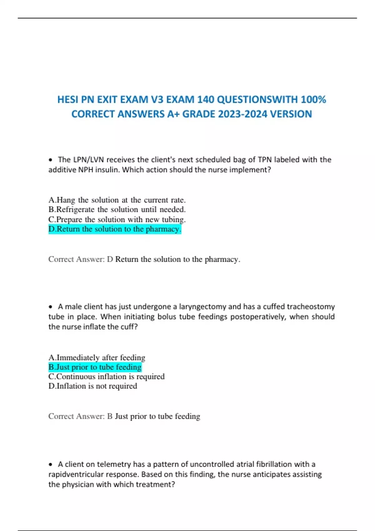 HESI PN EXIT EXAM V3 EXAM 140 QUESTIONS WITH 100% CORRECT ANSWERS A+ GRADE 2023