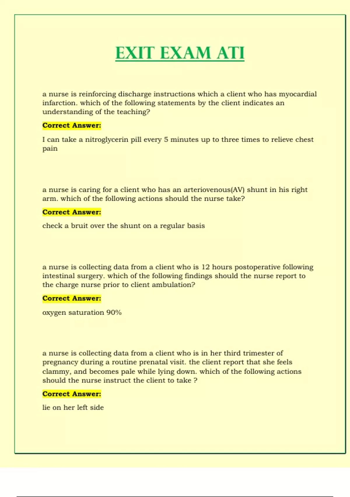 EXIT EXAM ATI a nurse is reinforcing dietary teaching with a female client who has an acute kidney injury. which of the following instructions should the nurse should include in the teaching? Correct Answer: Limit meat intake to less than 4 0z per day a nurse is reinforcing teaching with a client about how to collect a fecal occult blood sample. Which of the following statements by the client indicates an understanding of the teaching? Correct Answer: I should repeat the process three times A nurse is reinforcing preoperative teaching with a client who is about to undergo the creation of ileostomy. Which of the following information should the nurse include in the teaching? Correct Answer: Your initial drainage will be a dark green liquid. a nurse is collecting a health history from a parent of 4 year old child. which of the following statements to be is the priority for the nurse to address? Correct Answer: I have noticed that my child is withdrawn since we switched day care providers a nurse is caring for a client who reports having a decrease in fetal movement following an external cephalic version 6 hours ago. the nurse identifies the fetus is in the right occiput anterior position. the nurse should place the fetal heart rate monitor on which of the following sites to auscultate the fetal heart rate? Correct Answer: lower right of the stomach a nurse is caring for a 3 year old child at a well child visit the parents report they are concerned that their son has begun playing with an imaginary friend which of the following responces should the nurse make? Correct Answer: this is common behavior for children of this age a nurse is collecting data from a client who is postoperative and received an opioid analgesic for pain. which of the following findings should the. nurse identify as as adverse effect of this medication? Correct Answer: tachypnea a nurse in an inpatient facility is caring for a client who has anorexia nervosa at home, the client exercised frequently throughout. which of the following intervention should the nurse implement? Correct Answer: observe the client during meals A nurse is admitting a client who has Vancomycin-resistant enterococcus (VRE) of the urine. Which of the following types of isolation should the nurse place the client in? Correct Answer: contact precautions