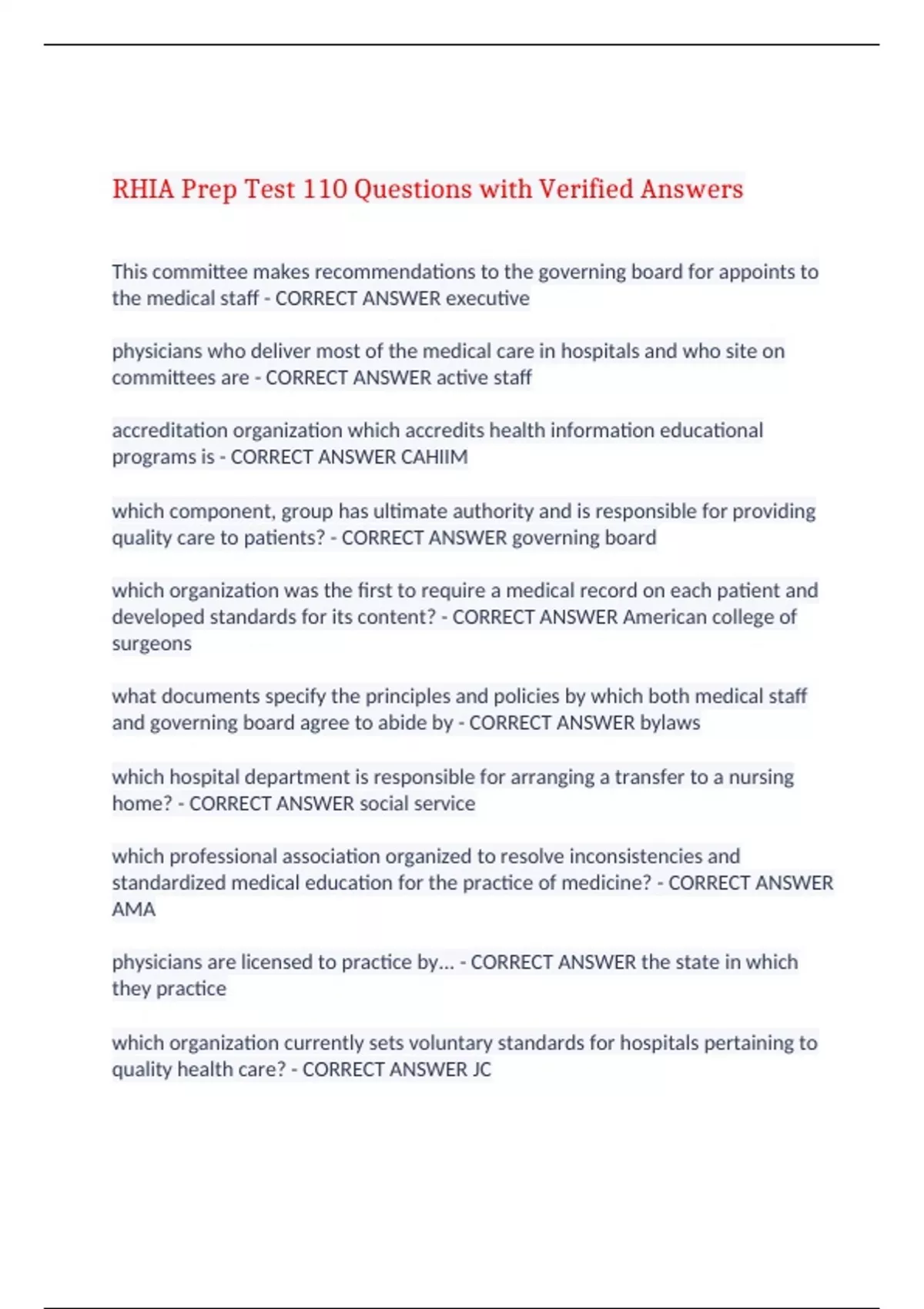 RHIA Prep Test 110 Questions with Verified Answers This committee makes recommendations to the governing board for appoints to the medical staff - CORRECT ANSWER executive physicians who deliver most of the medical care in hospitals and who site on committees are - CORRECT ANSWER active staff accreditation organization which accredits health information educational programs is - CORRECT ANSWER CAHIIM which component, group has ultimate authority and is responsible for providing quality care to patients? - CORRECT ANSWER governing board which organization was the first to require a medical record on each patient and developed standards for its content? - CORRECT ANSWER American college of surgeons what documents specify the principles and policies by which both medical staff and governing board agree to abide by - CORRECT ANSWER bylaws which hospital department is responsible for arranging a transfer to a nursing home? - CORRECT ANSWER social service which professional association organized to resolve inconsistencies and standardized medical education for the practice of medicine? - CORRECT ANSWER AMA physicians are licensed to practice by... - CORRECT ANSWER the state in which they practice which organization currently sets voluntary standards for hospitals pertaining to quality health care? - CORRECT ANSWER JC cost of care is based on the patient's ability to pay - CORRECT ANSWER sliding scale numbering system will generate gaps in filing space when records are pulled forward to the most recent medical record number assigned to patient - CORRECT ANSWER serial-unit numbering What is the format of the progress notes of a problem oriented medical record? - CORRECT ANSWER SOAP ASTM developed a standard to provide guidance for collection of data for the purpose of.. - CORRECT ANSWER computerizing the patient record primary purpose of quantitative analysis - CORRECT ANSWER to have a complete medical record what resource provides standard definitions for inpatient data commonly collected in acute care hospitals? - CORRECT ANSWER UHDDS What is aggregate data? - CORRECT ANSWER data combined from several measurements ex: data the media uses to report on health info of epidemiological interest to the public when records are analyzed for deficiencies on the unit while the patient is still in house, this is called? - CORRECT ANSWER concurrent analysis confirmation of the diagnosis and treatment options from another physician within the same specialty is called? - CORRECT ANSWER a second opinion cancer registries can be accredited by? - CORRECT ANSWER ACS case files of cancer patients are abstracted when - CORRECT ANSWER patient is diagnoses and/or treated a graph most frequently used to present continuous data? - CORRECT ANSWER histogram the filing system used in an electronic environment? - CORRECT ANSWER straight numeric assessment of nursing productivity is usually based on - CORRECT ANSWER inpatient service days full time responsibility for the operation of a hospital is delegated by the governing board to the - CORRECT ANSWER CEO the system of numbering in which a patient receives a number on his first admission to the hospital and retains that number on all subsequent admissions to the hospital is - CORRECT ANSWER unit what is the function of CAHIIM - CORRECT ANSWER accrediting college educational programs quantitative analysis purpose - CORRECT ANSWER complete medical record qualitative analysis purpose - CORRECT ANSWER consistent medical record standards are published by the JC for all types of facilities except? - CORRECT ANSWER public health purpose of a two digit modifier - CORRECT ANSWER 1. append to either CPT or HCPCS level II services 2. they indicate a service or procedure that has been altered but doesn't change description Coding rule for coding outpatient dx documented as probable, suspected, rule out conditions - CORRECT ANSWER it should not be coded as if they are established. first organization to implement minimum standards for hospitals - CORRECT ANSWER ACS What are three things HITECH has encouraged/required the use of - CORRECT ANSWER 1. meaningful use 2. Health Information Exchanges 3. EHRs what is benchmarking - CORRECT ANSWER comparing something against a certain standard NPDB - CORRECT ANSWER national practitioner data bank maintains reports on medical malpractice settlements, clinical privilege actions, and professional society membership actions against licensed health providers HIPDB - CORRECT ANSWER healthcare integrity and protection data bank maintains reports on civil judgement, criminal conventions of licensed healthcare providers, federal and state licensing and certification actions, and exclusions from participation in federal or state healthcare programs HEDIS - CORRECT ANSWER healthcare effectiveness data and information set measures performance on important dimensions of care and service. allows health plans to see where they need to focus their improvement efforts NCQA - CORRECT ANSWER National committee for quality assurance non profit organization dedicated to improving healthcare quality physician query - CORRECT ANSWER requesting clarification for inconsistent, ambiguous, or incomplete documentation for coding nomenclature - CORRECT ANSWER naming system controlled by rules clinical interface technology - CORRECT ANSWER systematic collection of health care related phrases that can be converted to structured data elements recognized between computer programs UMLS - CORRECT ANSWER unified medical language system converts terms from one vocabulary to another to enable information exchange between databases and systems how length of stay can affect the hospital's finances under PPS - CORRECT ANSWER the longer the patient stays, the more money the hospital loses. if the patient's stay is less than average LOS the hospital will not make as much money as they expect encoder - CORRECT ANSWER converts information from one code to another and keeps standardizati