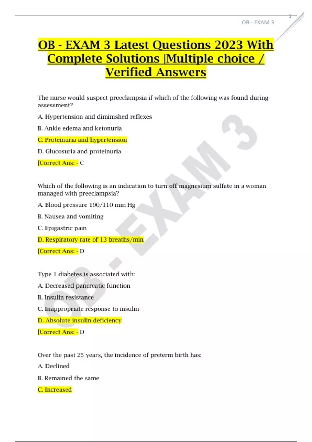 OB - EXAM 3 Latest Questions 2023 With Complete Solutions |Multiple choice / Verified Answers