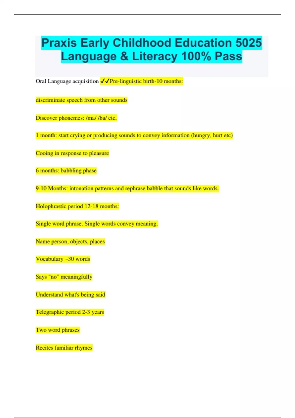 Praxis Early Childhood Education 5025 Language & Literacy 100% Pass Oral Language acquisition Pre-linguistic birth-10 months: discriminate speech from other sounds Discover phonemes: /ma/ /ba/ etc. 1 month: start crying or producing sounds to convey information (hungry, hurt etc) Cooing in response to pleasure 6 months: babbling phase 9-10 Months: intonation patterns and rephrase babble that sounds like words. Holophrastic period 12-18 months: Single word phrase. Single words convey meaning. Name person, objects, places Vocabulary ~30 words Says "no" meaningfully Understand what's being said Telegraphic period 2-3 years Two word phrases Recites familiar rhymes 30 months: acquiring rules of syntax Complex period 3-5 Years: Acquisition slows vocabulary grows Morphology "foots" Mans" overgeneralization of rules Syntax and complex questions Semantics Written Language acquisition Pre Phonemic 0-6: No link between phonemes and graphemes Random scribbling Controlled Scribbling Circular Scribbling Drawing to convey messages Mock Letters Letter strings directional and down the page, no correlation to words Separated words spaces present Learning to spell: 6 years: Graphemes = phonemes Basic motor skills and basic spelling Consolidation 7-8 Years: Writing = spoken language casual, colloquial, lots of clauses Differentiation 9-10 Years: Writing different than speech Writing for different audiences Integration mid teens: Personal voice present Appropriate linguistic choices made Spelling Stages Prephonemic - scribbling and mock letters Semiphonetic: link letters and sounds to write Phonetic - phonemes represented by graphemes Phonics spelling stages Logographic: words learned as whole