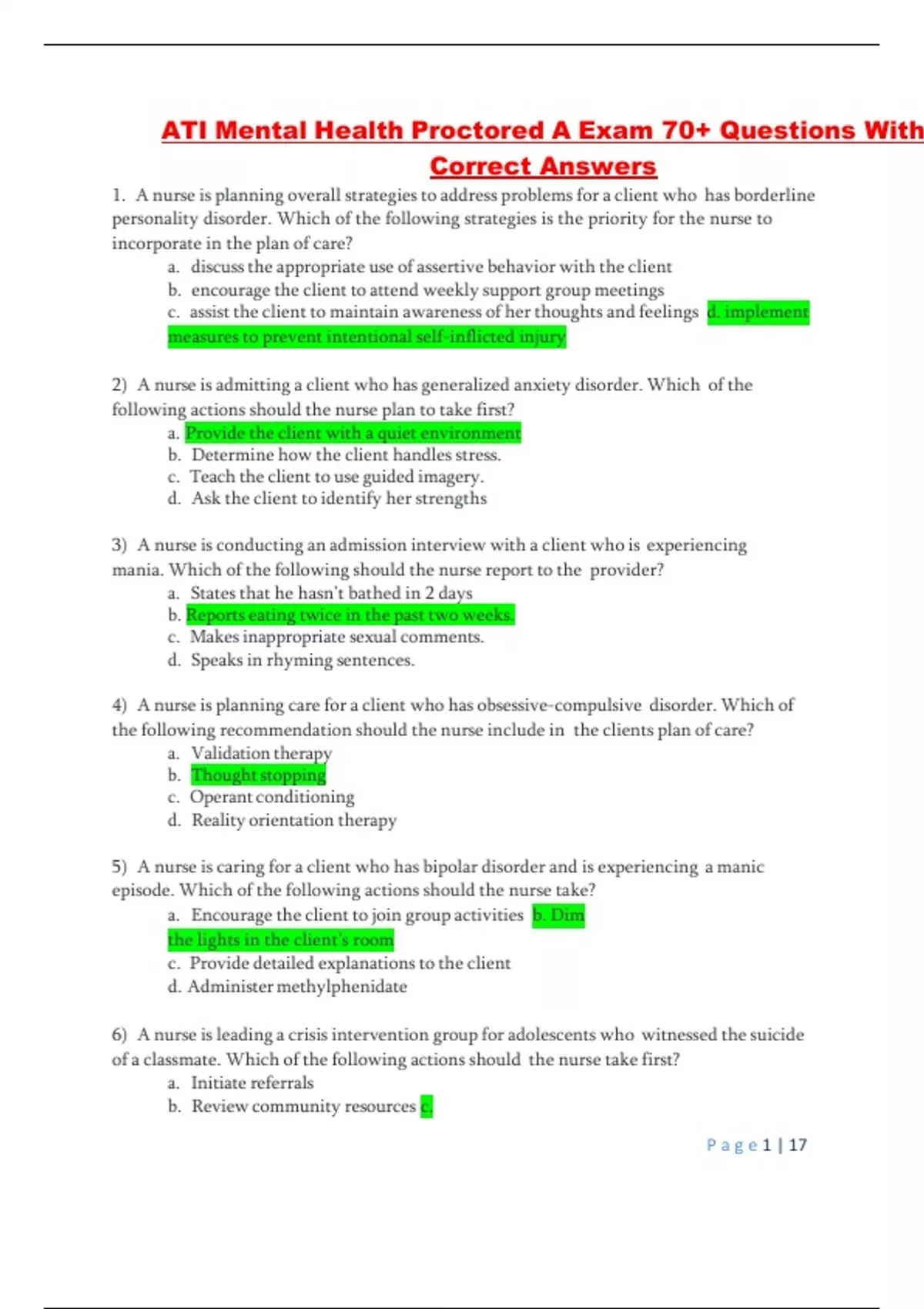 ATI Mental Health Proctored A Exam 70+ Questions With Correct Answers
